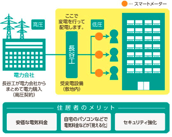 長谷工アネシスは、2012年4月から長谷工コーポレーションが設計・施工を行う新築分譲マンションや長谷工コミュニティが受託管理するマンションを中心に、安価な電気料金を提供できる高圧一括受電サービスをスタートしました。なお、首都圏・近畿圏・名古屋圏における新築分譲マンションの総供給戸数に対する長谷工コーポレーションの施工戸数の割合は20~30%、2012年11月末時点での施工累計戸数は52.6万戸です。