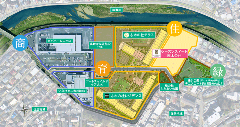 「ユメマチ」は、市の行政の中心である志木市役所と交通の中枢を担う東武東上線「志木駅」を結ぶライン上で、桜並木が美しい柳瀬川沿いに“住”・“商”・“育”・“緑”が複合した都市として誕生しました。約60,540㎡(東京ドームの約1.3倍)という広大な敷地には、ショッピングセンターや保育所、高齢者福祉施設(予定)、多彩な庭園を備えた「志木の杜レジデンス」(総戸数:319戸、竣工:2012年3月)・「志木の杜テラス」(総戸数:257戸、竣工2013年3月)・「シーズンスイート志木の杜」が一体となって整備され、潤いに満ちた住環境の中で、複合都市ならではの生活利便性と暮らしの安心を享受いただけます。