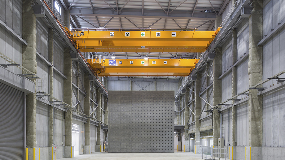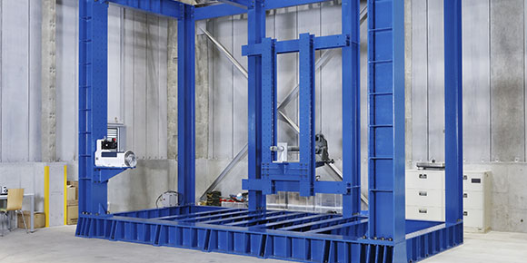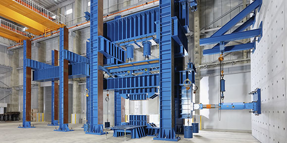 マンションの新しい構造や構工法の開発などを行う際には,耐震安全性など構造性能の確認が極めて重要になります。本エリアの中央に位置する反力床の上には、大型の構造実験を実施できる実験装置を2基設置しています。これらにより、柱梁等の部材や骨組などの構造性能を検証可能です。