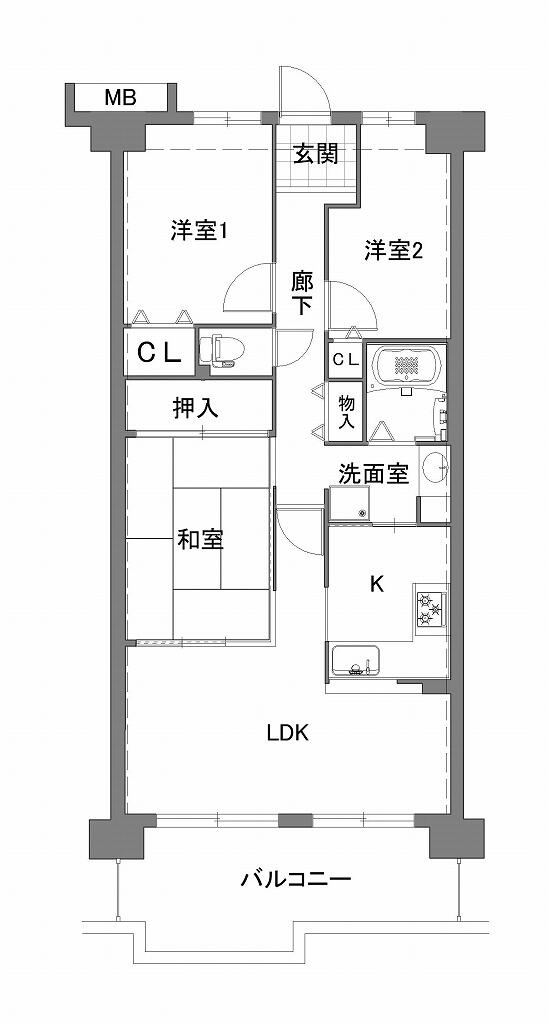 - リビングダイニング、キッチン、洗面、浴室、収納、トイレ、寝室、玄関/廊下