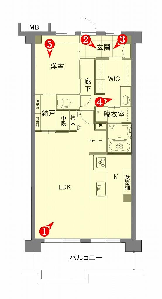 (図面の●もしくは写真の>をクリックすると移動します。写真上をクリックしながら動かすとお部屋の中を360°ご覧いただけます。)