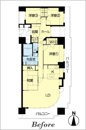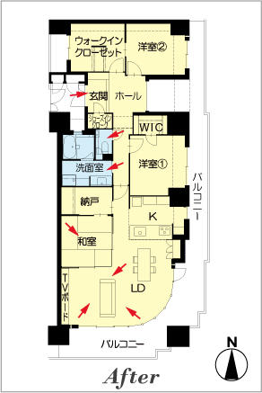 玄関横の洋室は廊下部分も取り込んで、再レイアウト。一室は家族共用のウォークインクローゼットに変更し収納を確保しています。