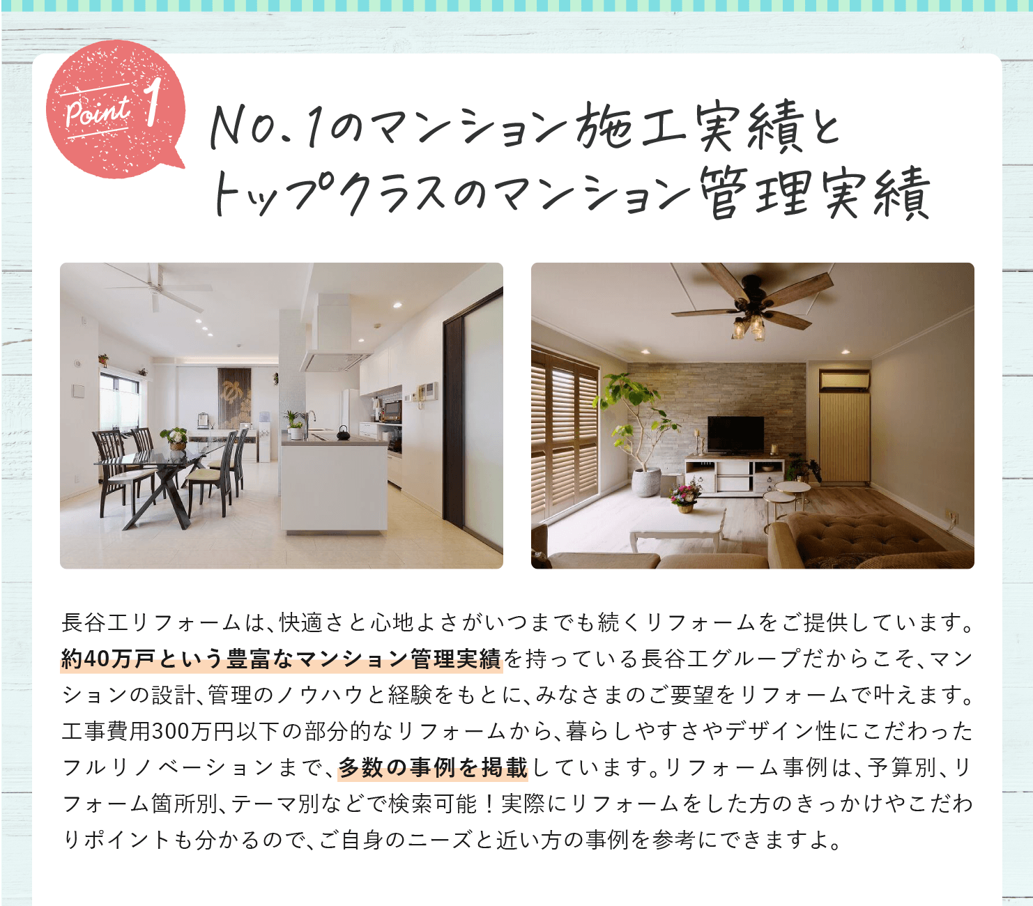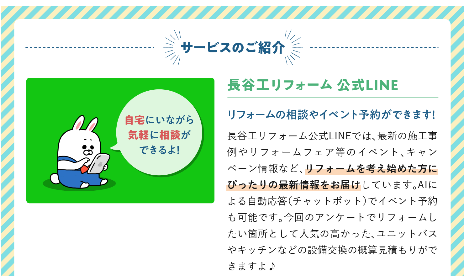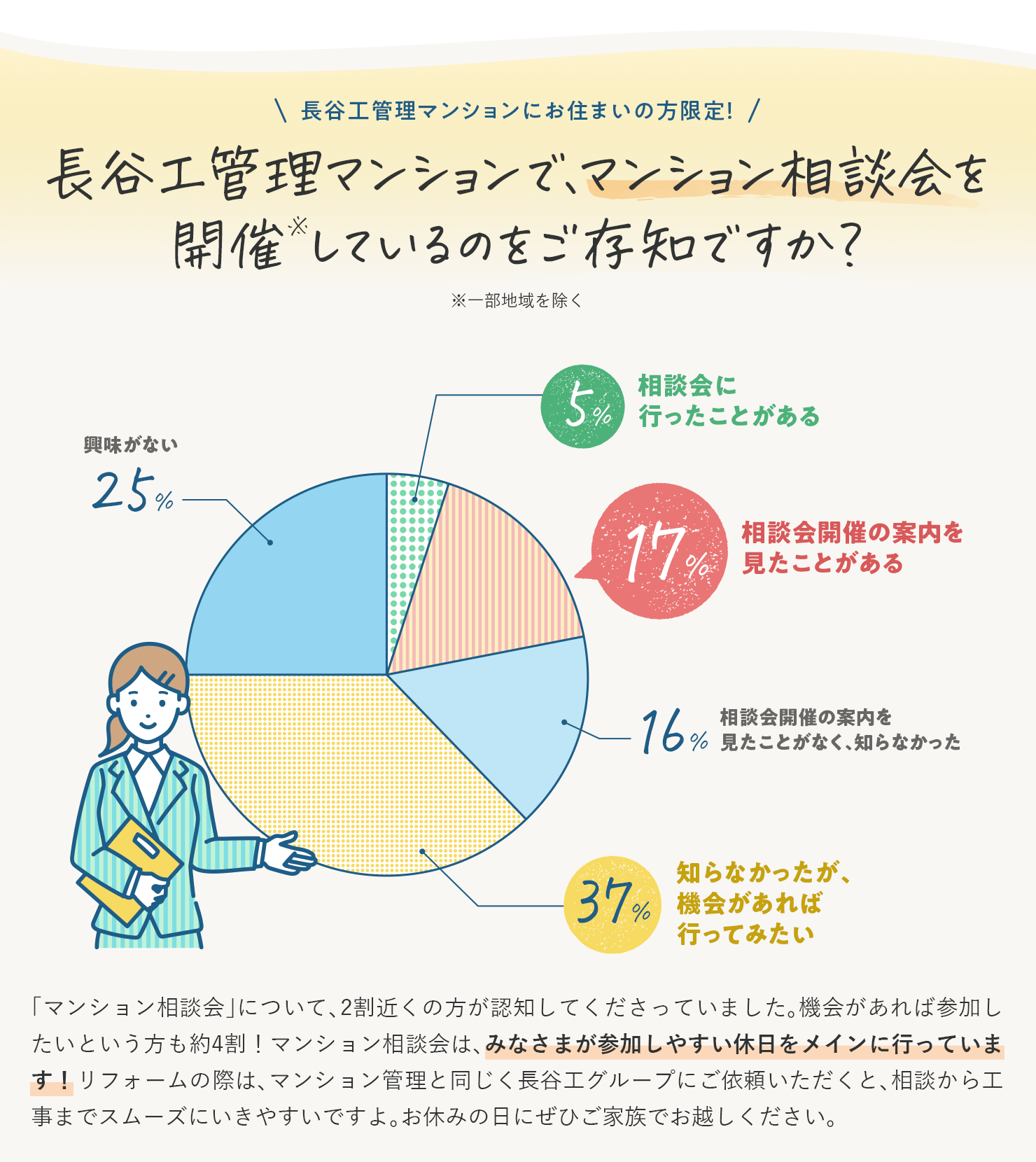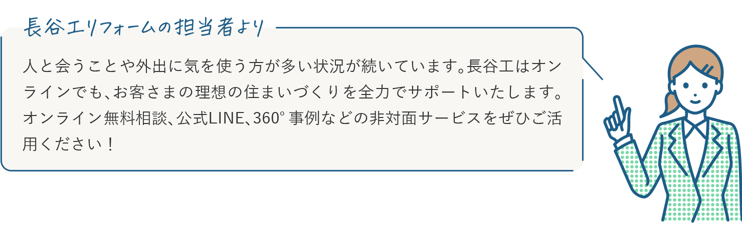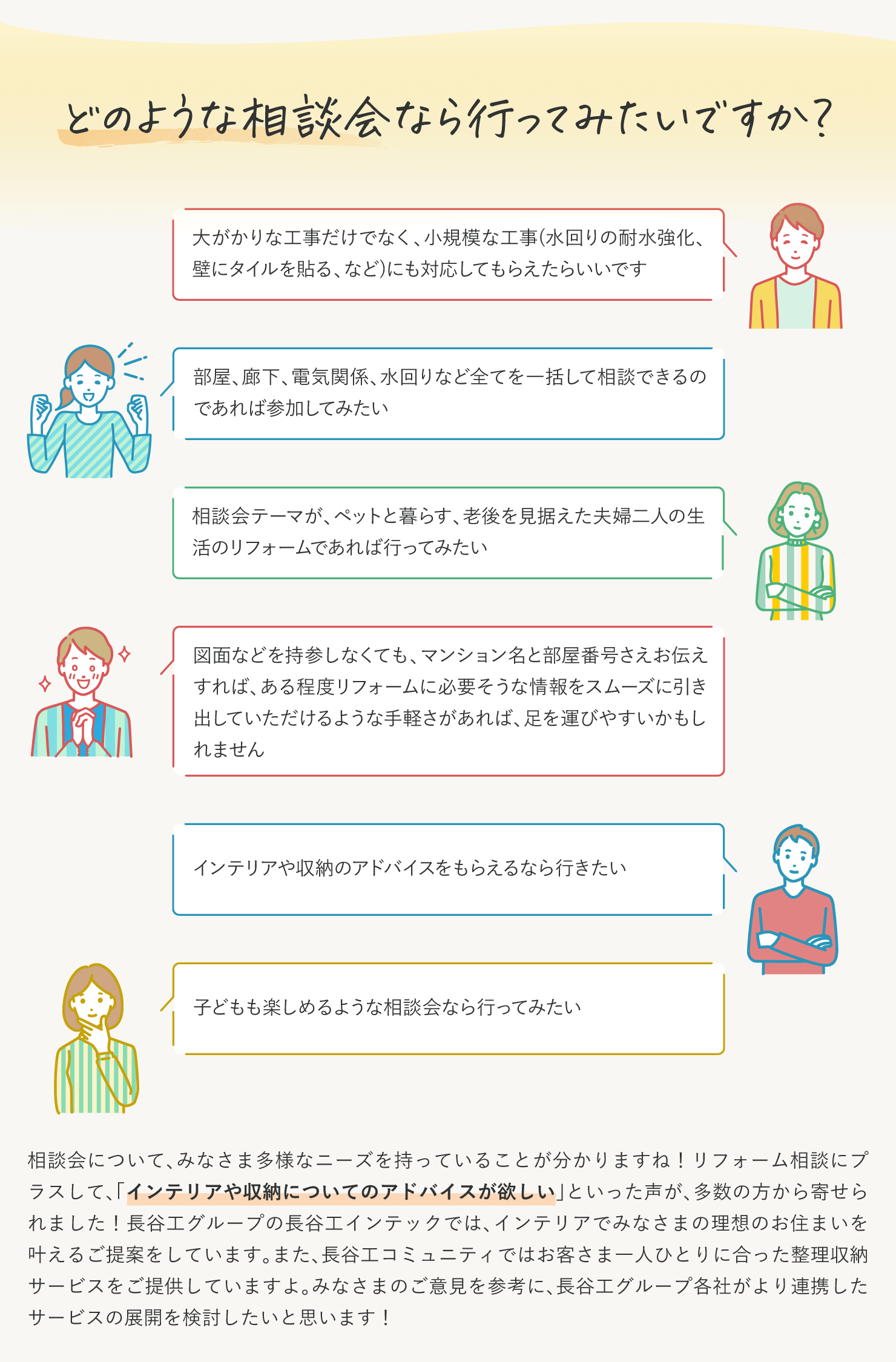 みなさまにリフォーム事情を伺ったアンケート結果はいかがでしたか? リフォーム箇所や予算といったリフォームに関する基本的なニーズから、ペットとの暮らし、オンライン対応といった今の社会状況に沿ったテーマについてもご紹介しました。 長谷工は、変化するみなさまの住まいに関するニーズにお応えするべく、最適なサービスを開発、提供し続けています!ぜひオンライン相談やマンション相談会にお気軽にお越しくださいね♪