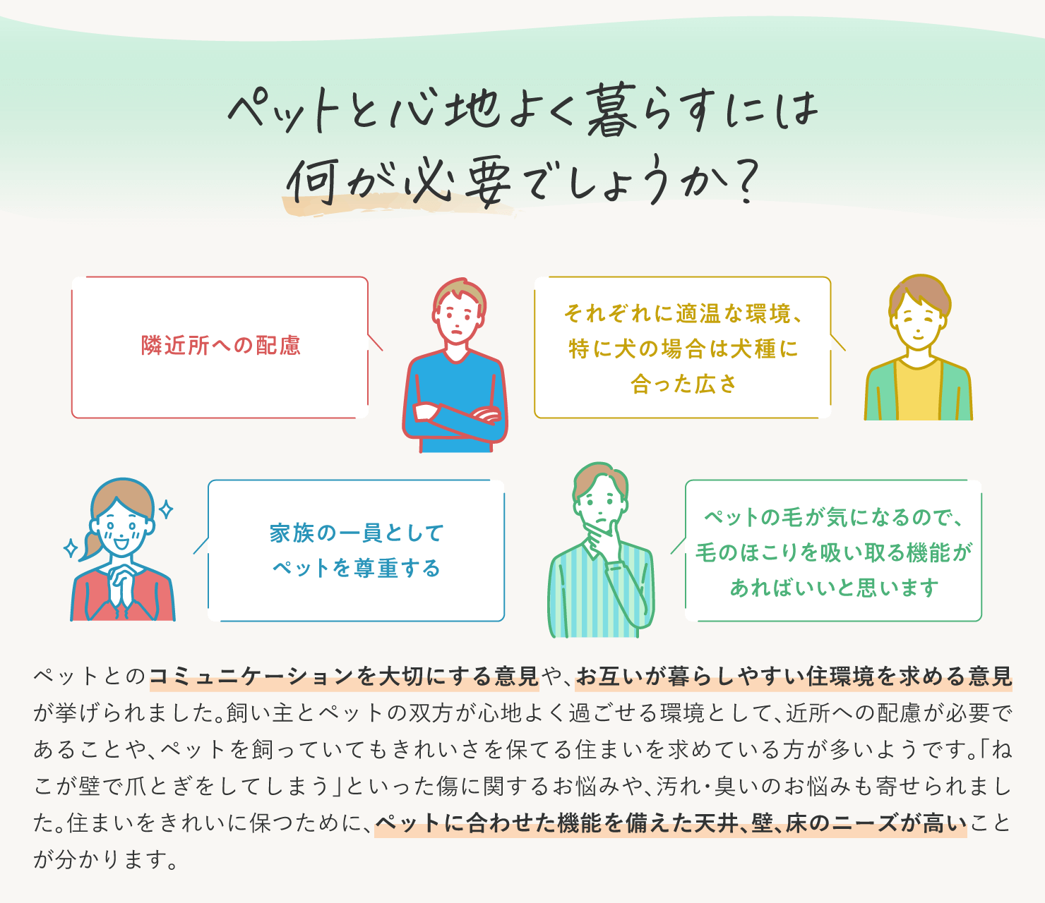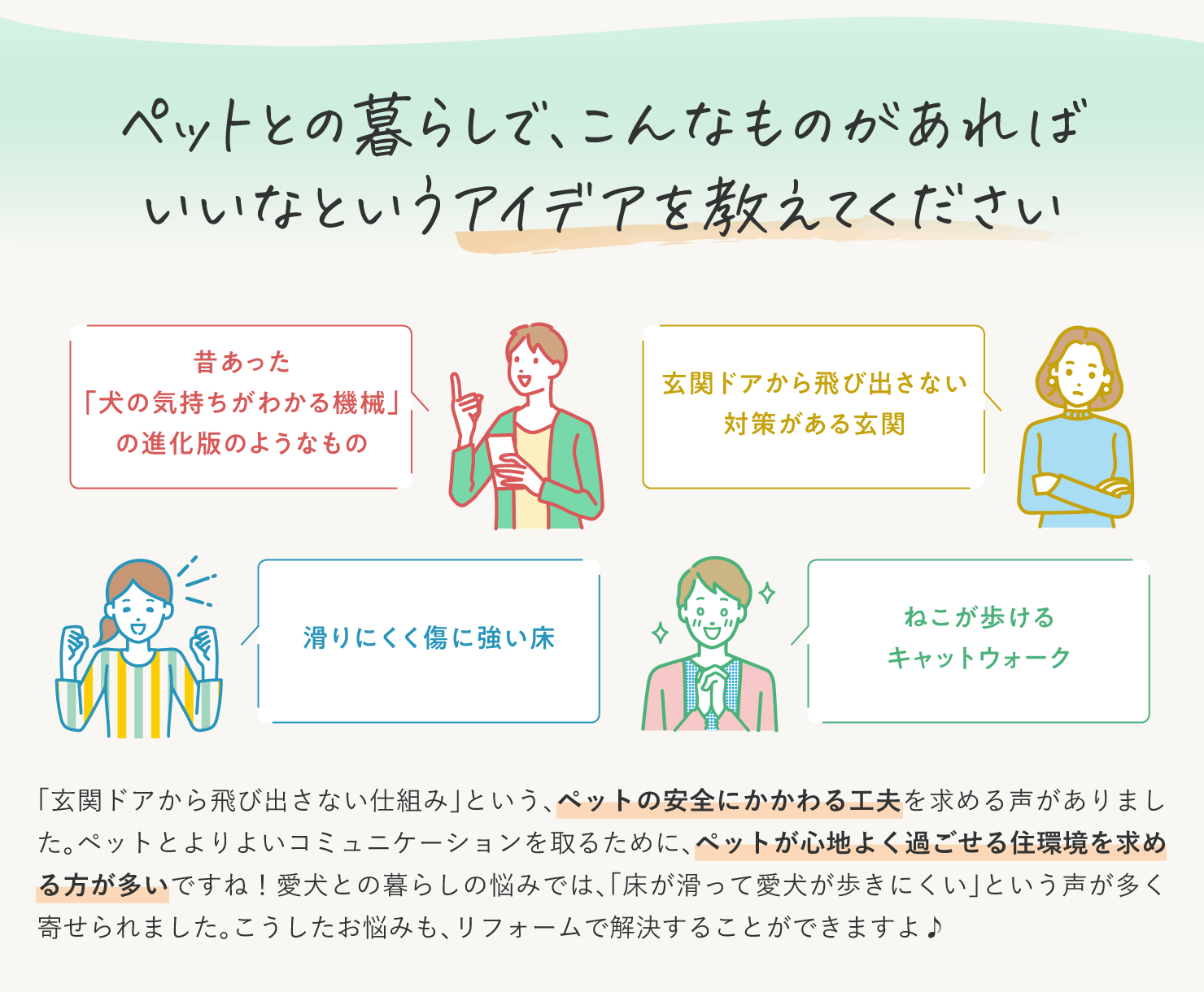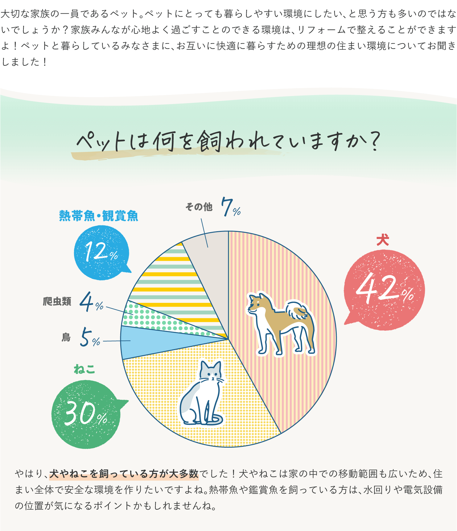 昨年から長く続く「おうち時間」も、日常になりつつありますね。社会的な規模で変化したライフスタイルに合わせて、住まいも心地よくしたいと考える方が増えているのではないでしょうか?また、長い時間を家で過ごすようになったことで、室内の経年劣化がより気になりだした方もいるかもしれません。そこで今回は、会員のみなさまにリフォームについてのアンケートを実施しました!リフォームを意識したときに気になるのが、一緒に暮らす家族のことやリフォームに向けた情報収集の方法。レポートでは、大切な家族の一員であるペットとより快適に暮らしたい方に向けたサービスや、外出が気になる今、おうちからでもリフォームについて相談や情報収集ができるオンラインサービスについてもご紹介します!