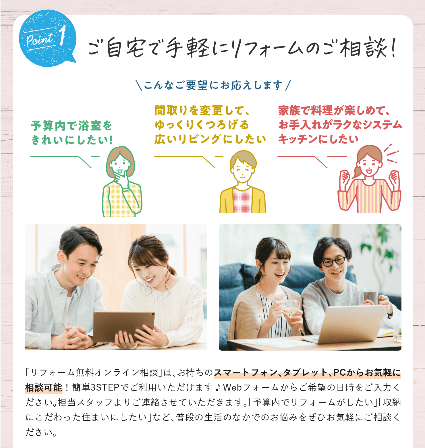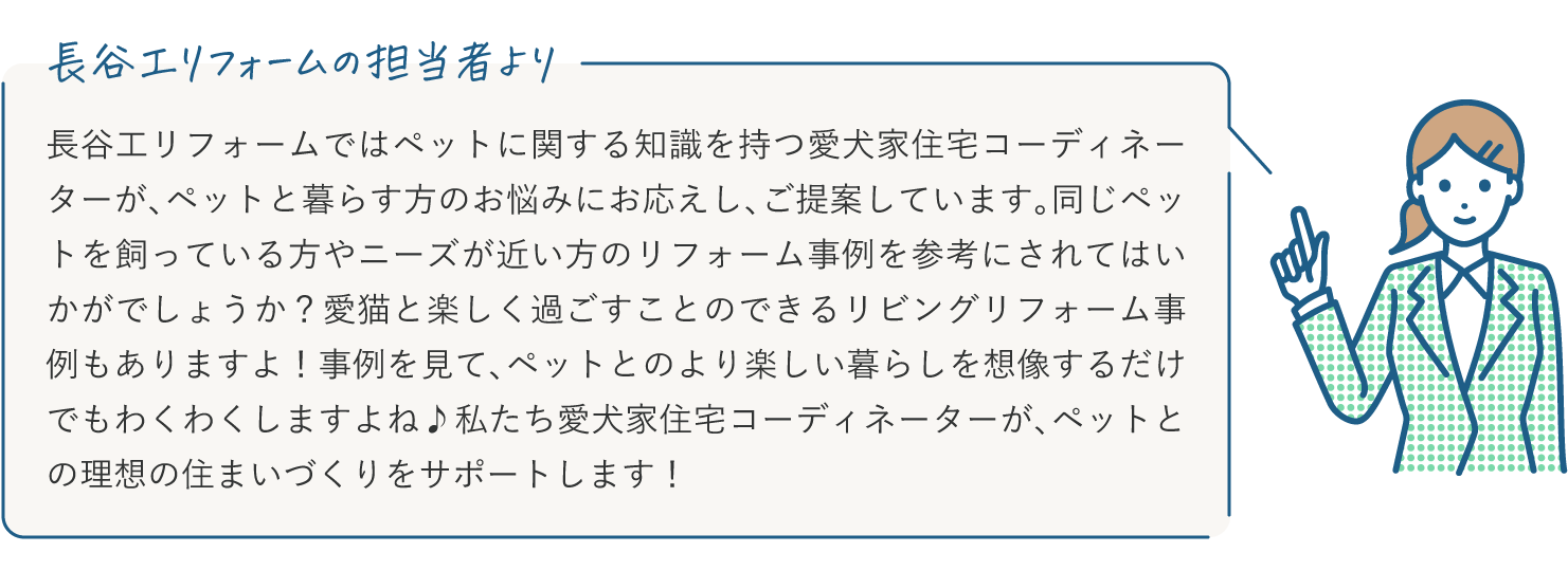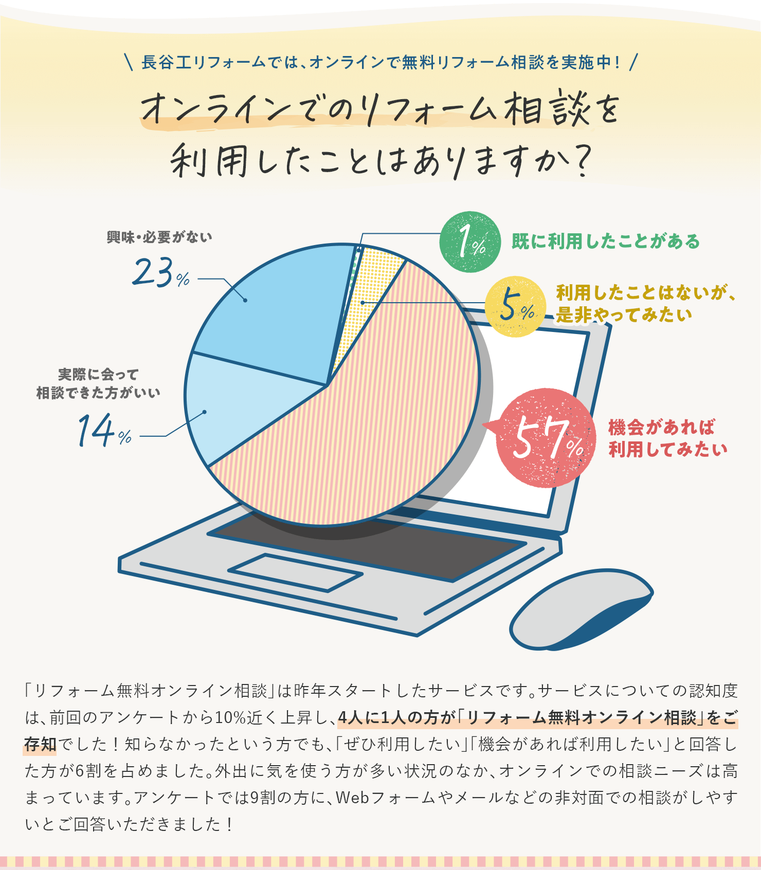 昨年から長く続く「おうち時間」も、日常になりつつありますね。社会的な規模で変化したライフスタイルに合わせて、住まいも心地よくしたいと考える方が増えているのではないでしょうか?また、長い時間を家で過ごすようになったことで、室内の経年劣化がより気になりだした方もいるかもしれません。そこで今回は、会員のみなさまにリフォームについてのアンケートを実施しました!リフォームを意識したときに気になるのが、一緒に暮らす家族のことやリフォームに向けた情報収集の方法。レポートでは、大切な家族の一員であるペットとより快適に暮らしたい方に向けたサービスや、外出が気になる今、おうちからでもリフォームについて相談や情報収集ができるオンラインサービスについてもご紹介します!