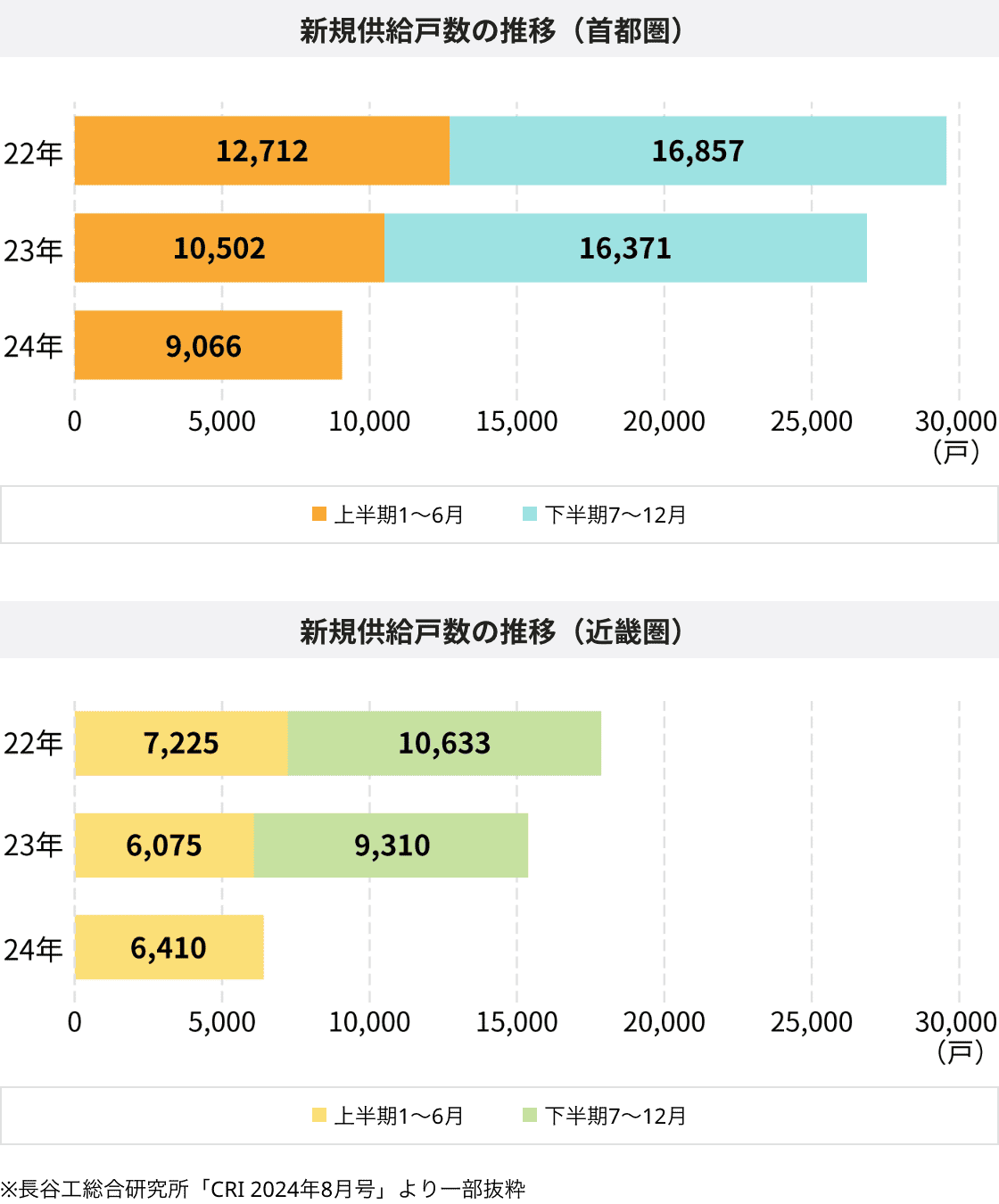 長谷工総合研究所のデータによると、2024年上半期の新築マンションの新規供給戸数は、首都圏で前年同期比13.7%減、近畿圏で5.5%増の結果でした。近畿圏では微増しているものの、新型コロナウイルス感染拡大以前の水準には及ばない状況です。新築マンションの新規供給戸数の回復が進まないなか、「住み替え」についての傾向を調査しました。