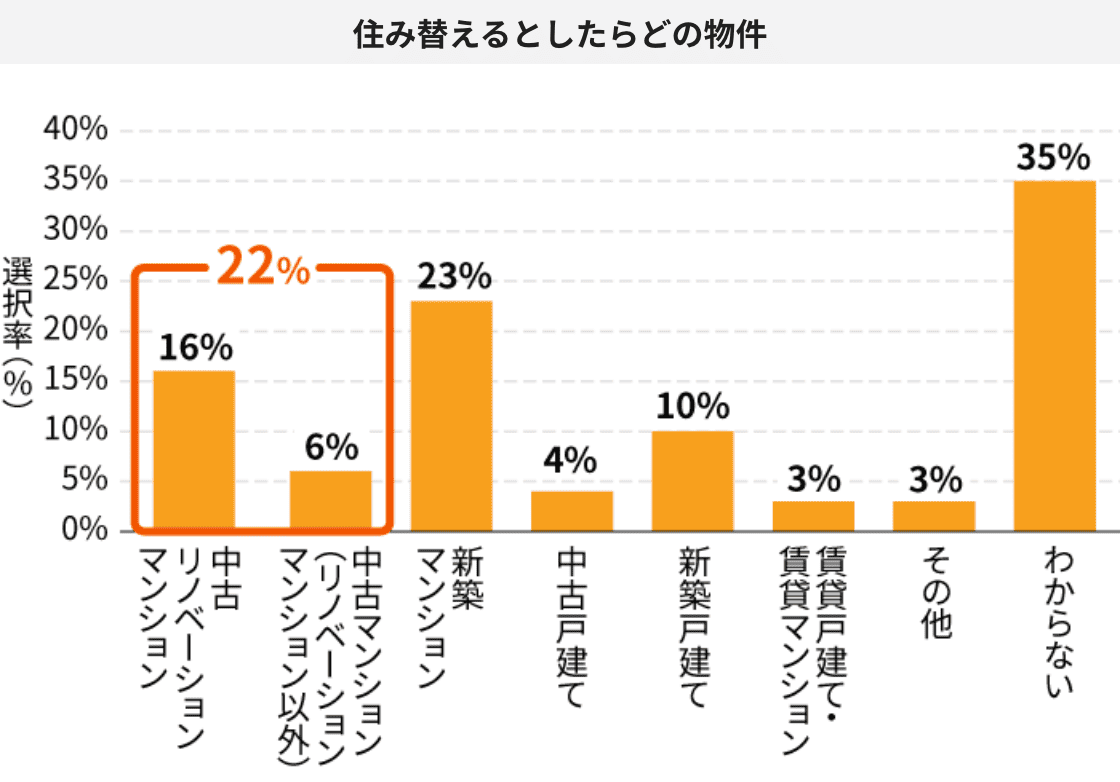 「住み替えを考えるとしたらどの物件が良いか?」という問いに対して、「新築マンション」を選択した人が23%と最も多くなりました。