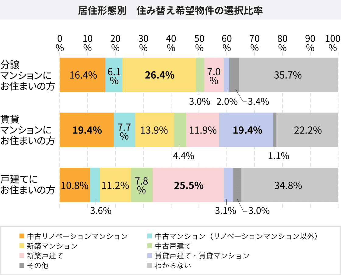 住み替え希望物件を居住形態別に見ると、分譲マンション居住者の1/4を占める26.4%の人が「新築マンション」を選択しており、次いで「中古リノベーションマンション」が16.4%となっています。一方で、賃貸マンション居住者については、「賃貸戸建て・賃貸マンション」と「中古リノベーションマンション」を選択した人がいずれも19.4%で、同率トップでした。