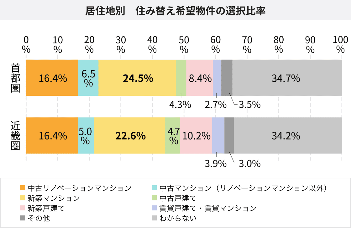 住み替え先の選択比率としては、首都圏・近畿圏を比較しても大きな差はありません。首都圏においては、「新築マンション」の次に「中古リノベーションマンション」が選択されています。近畿圏では、「新築マンション」に対して、「中古リノベーションマンション」(16.4%)と「中古マンション(リノベーションマンション以外)」(5.0%)を合わせて21.4%と、ほぼ同等の比率で中古マンションが選ばれています。