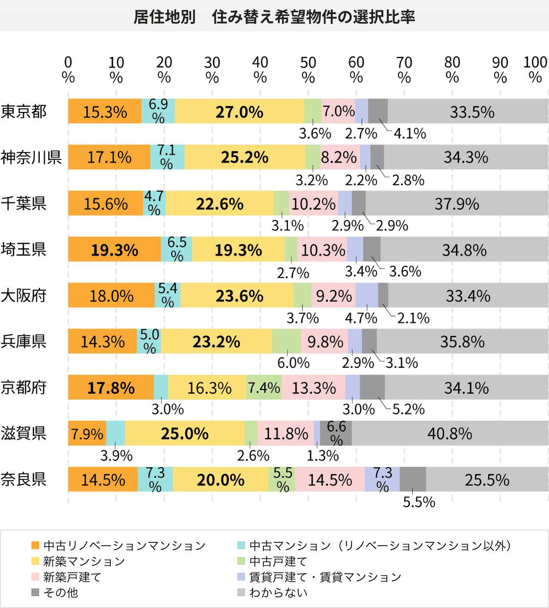 都道府県別では、埼玉県において「新築マンション」と「中古リノベーションマンション」の選択比率が同等であり、京都府では「中古リノベーションマンション」が「新築マンション」を上回っています。京都府には歴史的な景観と文化財を保護するための低層住居専用地域が多く、古い建物をリノベーションして住むことが文化的に受け入れられている背景があると考えられます。