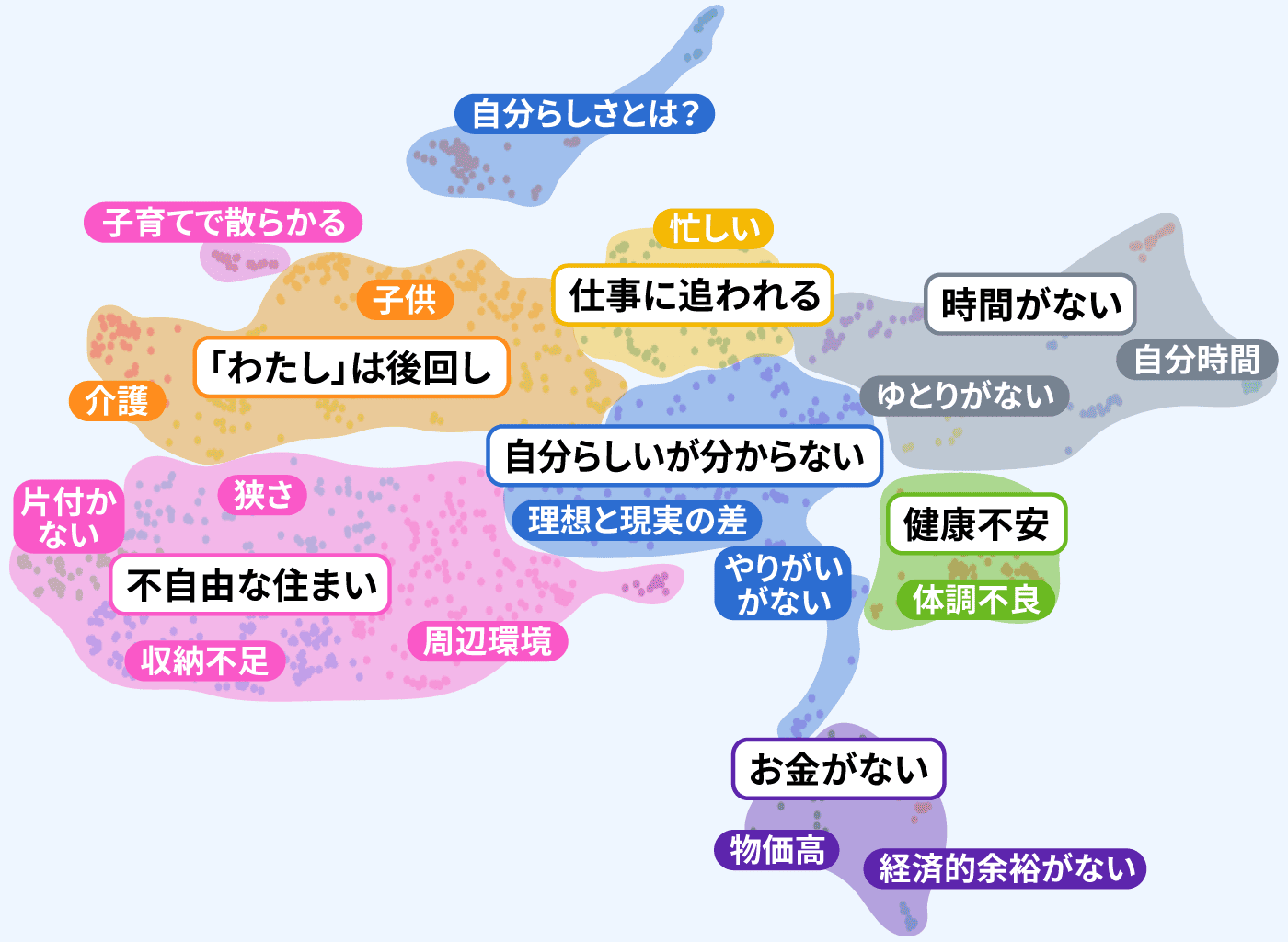 一方、女性は「古さと狭さで整わない」「狭くて雑然とした家」といったグループが多く、現在の住まいが整理整頓されていなく、狭く感じることが気になるようです。