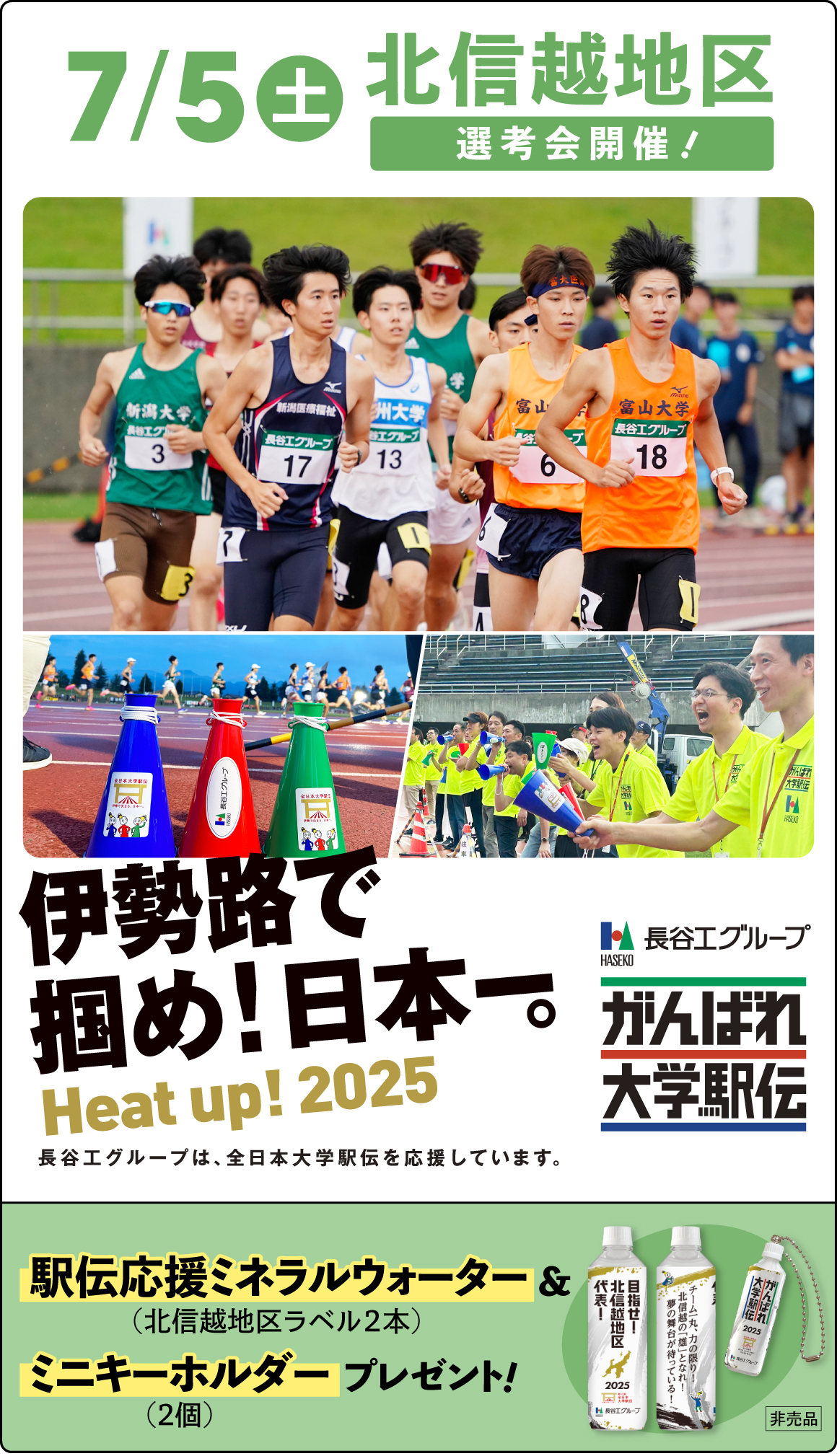 今回は、7/5(土)の北信越地区選考会開催に合わせ、長谷工が選考会に出場する選手たちへ差し入れしているオリジナルグッズ「駅伝応援ミネラルウォーター(北信越地区ラベル)」2本とミニキーホルダー2個セット(いずれも非売品)をプレゼント!