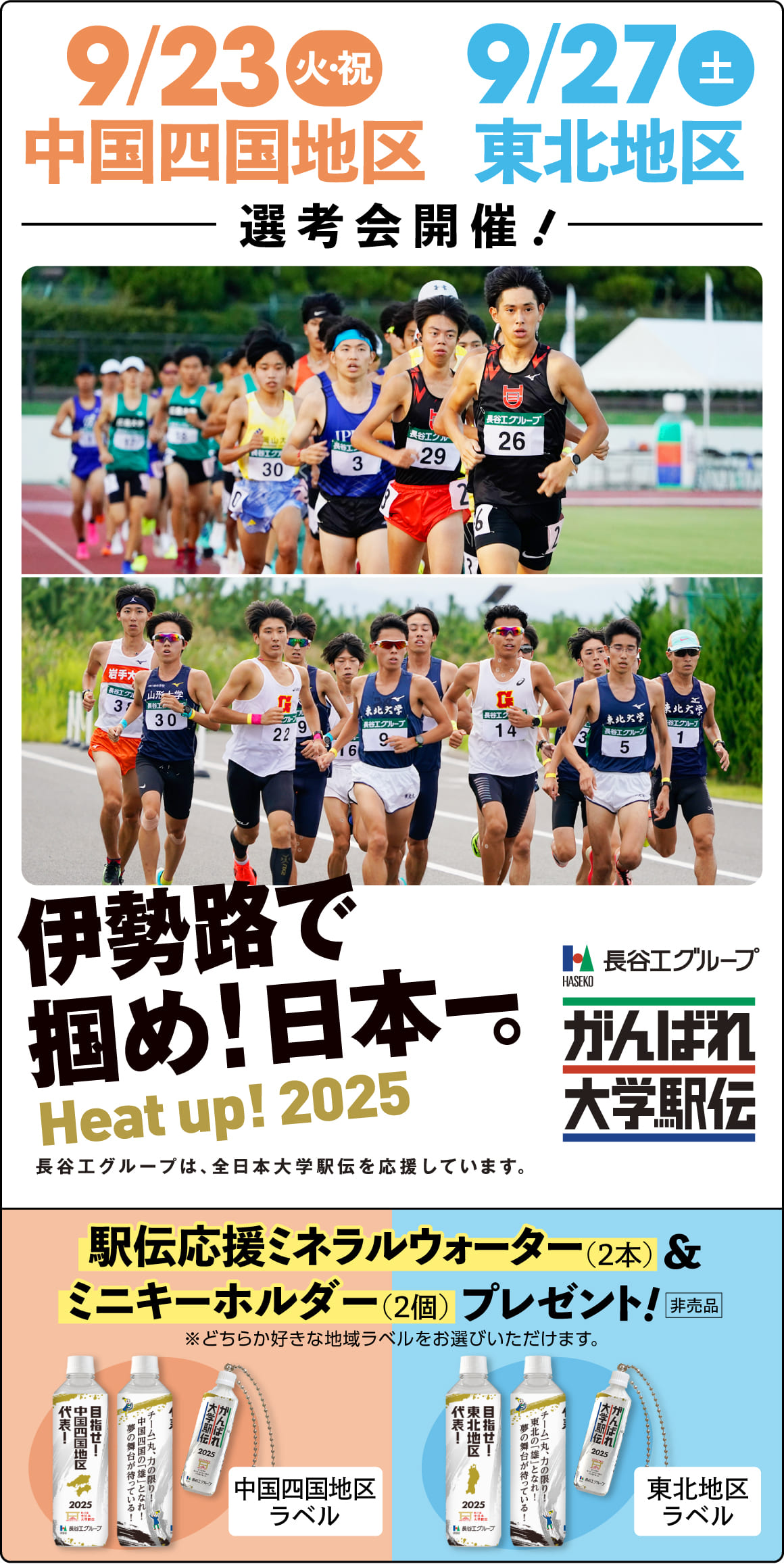 今回は、9/23(火・祝)の中国四国地区選考会・9/27(土)の東北地区選考会開催に合わせ、長谷工が選考会に出場する選手たちへ差し入れしているオリジナルグッズ「駅伝応援ミネラルウォーター(中国四国地区ラベルまたは東北地区ラベル