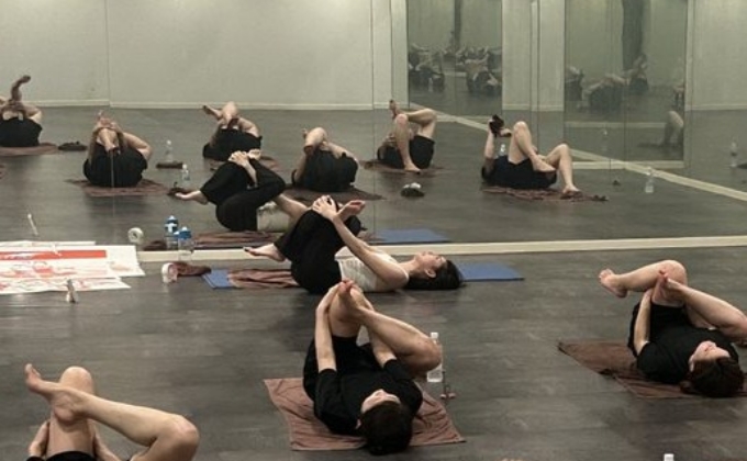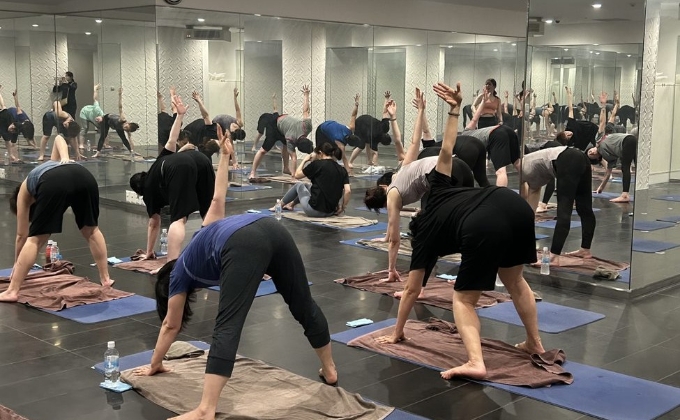 室温40℃・湿度55%のじんわりと汗が出る空間で、ヨガのスタート!今回は初心者の方に多く参加いただいていましたが、CALDOインストラクターの方が丁寧に教えてくれたおかげで、みなさましっかりついてきていただけたようでした。