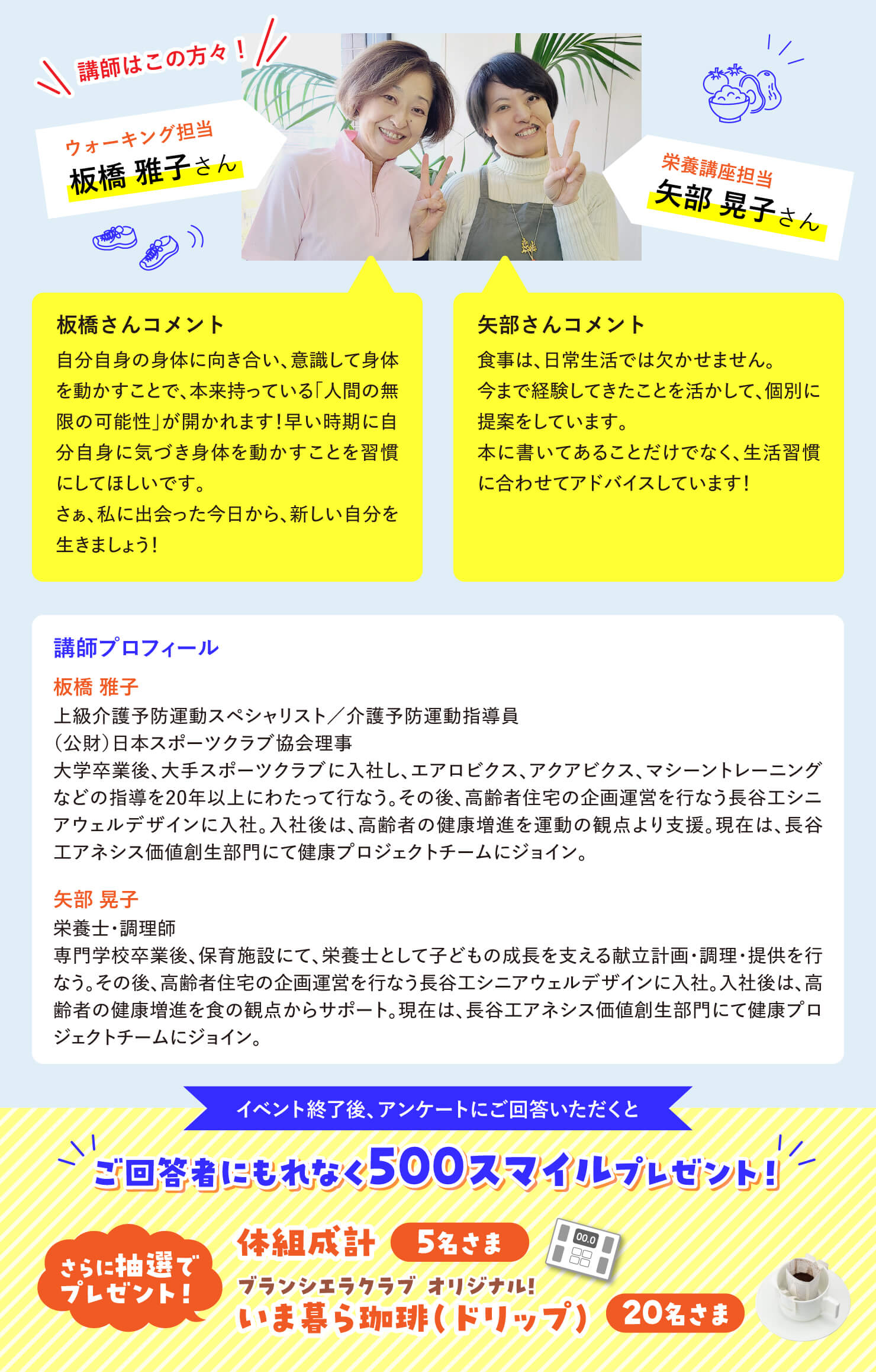 いつもの歩き方をちょっと意識するだけ。いつもの食事にプラスオンするだけ。普段の暮らしの中でできる健康習慣をプロから教わります!当日は、モニターによる実践を交えながら、姿勢の正し方やウォーキングのコツを聞いていきます。