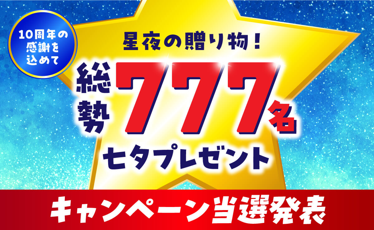 「星夜の贈り物!総勢777名七夕プレゼントキャンペーン」の当選者発表です!ご当選された方、おめでとうございます♪ なお、当選者のみなさまには、賞品の発送や連絡、配信をもって発表にかえさせていただきます。