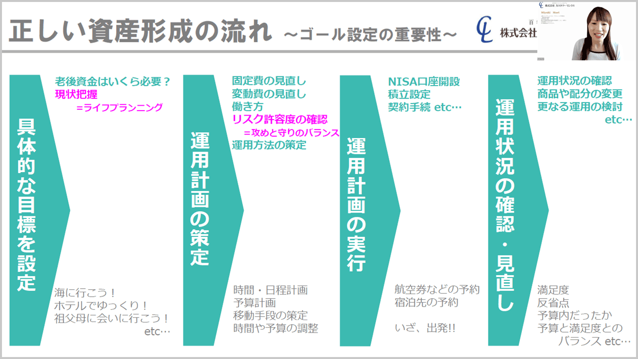 これまで貯蓄ばかりに意識が向いていましたが、資産をどう取り崩していくかという視点が新鮮でハッとさせられました。セミナーの内容は、老後の資金計画に役立つものだと思います。