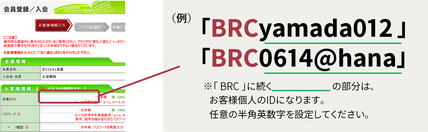 ご登録の際、会員IDの頭の部分に必ず「BRC」を入れてご登録ください。