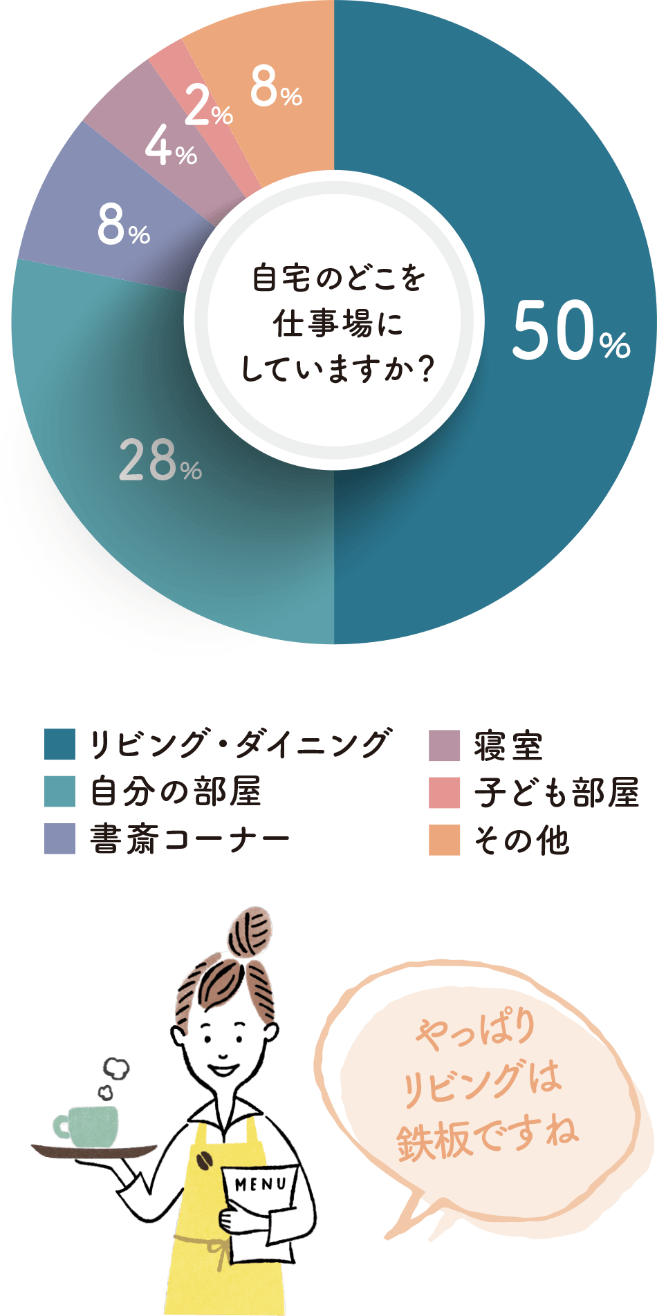 自宅での仕事場を尋ねたところ、なんと二人に一人は「リビング・ダイニング」を使っていることがわかりました。ダイニングテーブルやリビングの片隅に置いたデスクでパソコンを開き、幼い子どもの様子を見守りながらテレワーク。そんな子育てママやパパの奮闘する姿も目に浮かびます。次いで多いのが「自分の部屋」。なるほど、約3割の人はちゃんと個室を用意しているんですね。たしかに仕事に集中したいなら、個室が理想的。でも、現実は部屋数が足りなくて、仕方なくリビングやダイニングで仕事をしている人も多いのでは?
