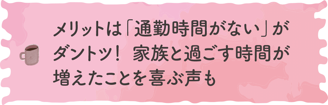 なかには「飼い犬とずっと一緒にいられる♪」、「ランチの後にお昼寝ができる♪」と喜ぶ人もいて、頬がゆるみます。また、通勤やオフィス業務での人との接触がなくなったため、「新型コロナウイルスに感染するリスクが減った」ことに安堵する人も大勢いました。テレワークの普及で、一刻も早く感染が防止されますように!