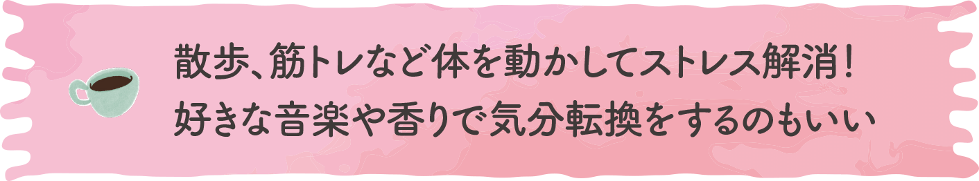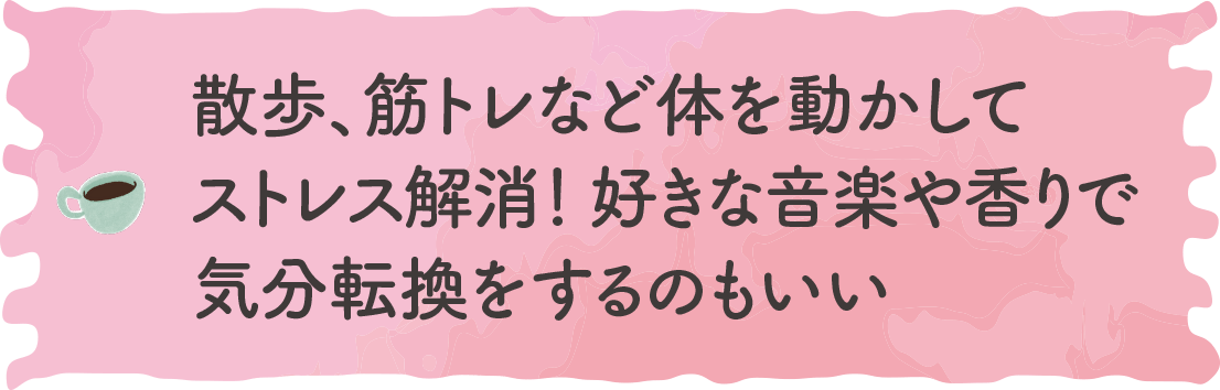 生活空間と同じ場で働くことによるイライラを減らすために、デスクに観葉植物を置く、壁に絵を飾る、心地よいBGMを流す、アロマオイルを香らせるなど、五感に気持ちいい仕事環境をつくることもおすすめします。また、ストレスを溜めないためには、規則正しい生活をすることが大切。起きたらストレッチをする、仕事を始める前に着替えるなど、自分なりのルールを決めてはいかがですか?