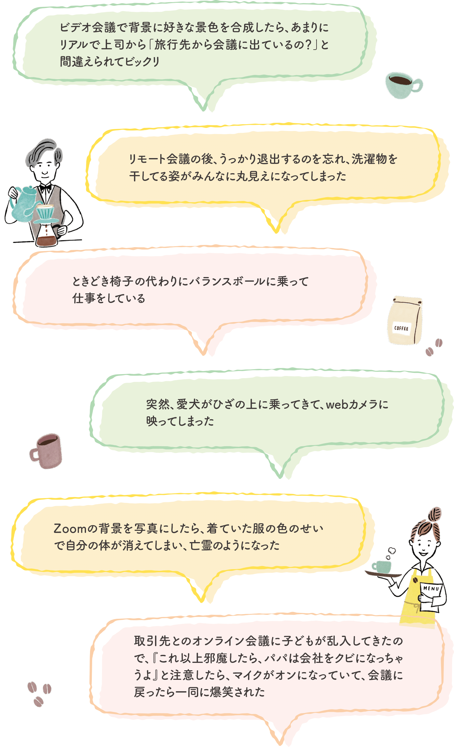 パソコンデスク、オフィスチェア、ヘッドセットの購入、エアコンの交換、明るさの調整できる照明の設置など、けっこう設備にお金をかけていることがわかります。変わったところでは、「フットマッサージ器を足下に置いて、マッサージを行なう」という人もいました。足つぼを刺激すると、なるほど疲れに効きそうですね。また、ビデオ会議で気になるのが室内の映り込み。「部屋の模様替えをした」「バーチャル背景を取り入れた」「お洒落なパーティションを買った」など、生活感が丸見えにならないように気をつかっています。