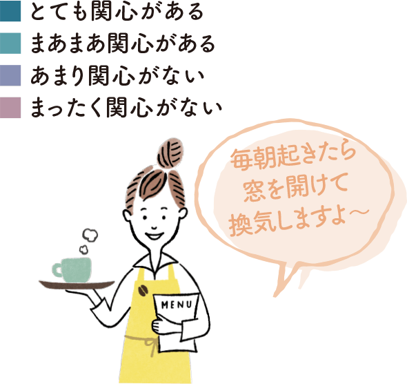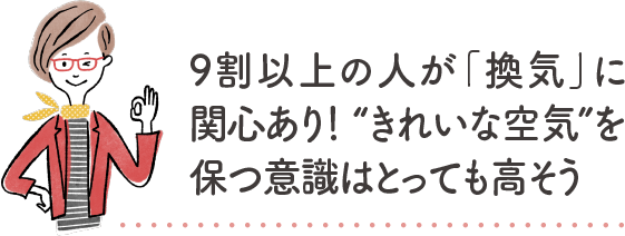 新型コロナウイルス感染症が世界的に流行し、私たちの暮らしに大きな影響を及ぼしています。外出自粛やテレワークによって在宅時間が増えたこともあり、室内が密閉空間にならないよう、換気の大切さにあらためて気づいた人も多いのではないでしょうか。会員のみなさんに尋ねたところ、なんと家の中の換気について、9割以上の人が関心を持っているとのこと。しかも、「とても関心がある」という意識の高い人が半数近くに上りました。換気は2時間に1回、5~10分程度が目安とされています。特に気密性の高いマンションでは、健やかな暮らしのために空気の入れ換えが欠かせません。換気の効率を上げるために、給気口、換気口、エアコンなどのお手入れもお忘れなく!