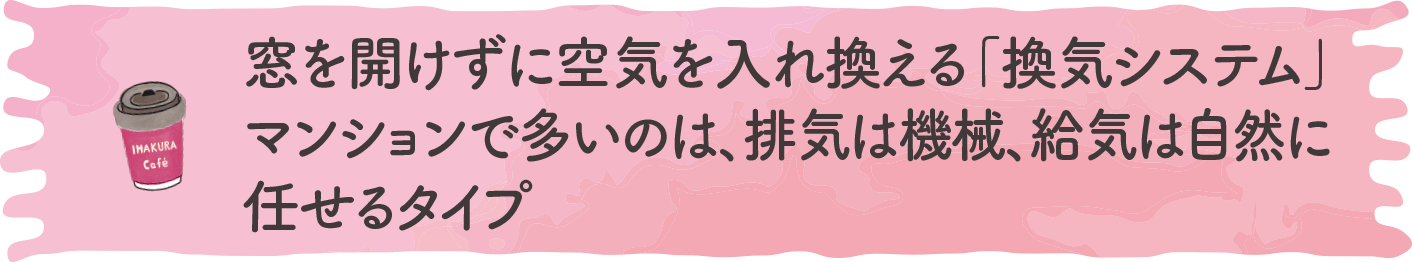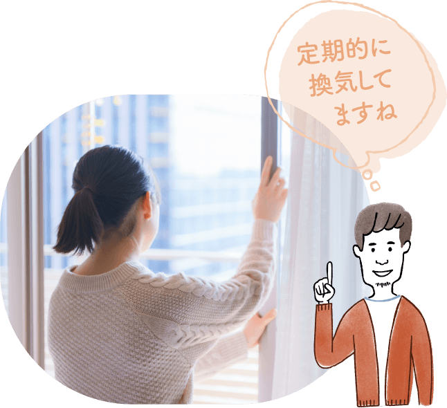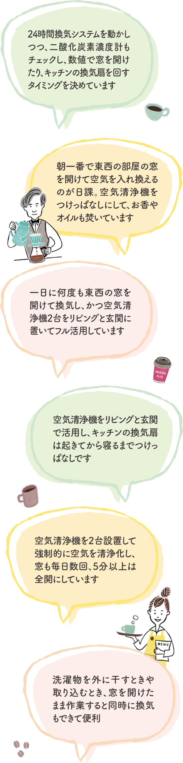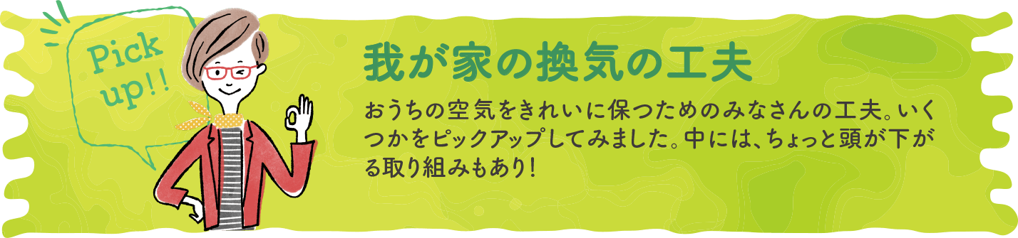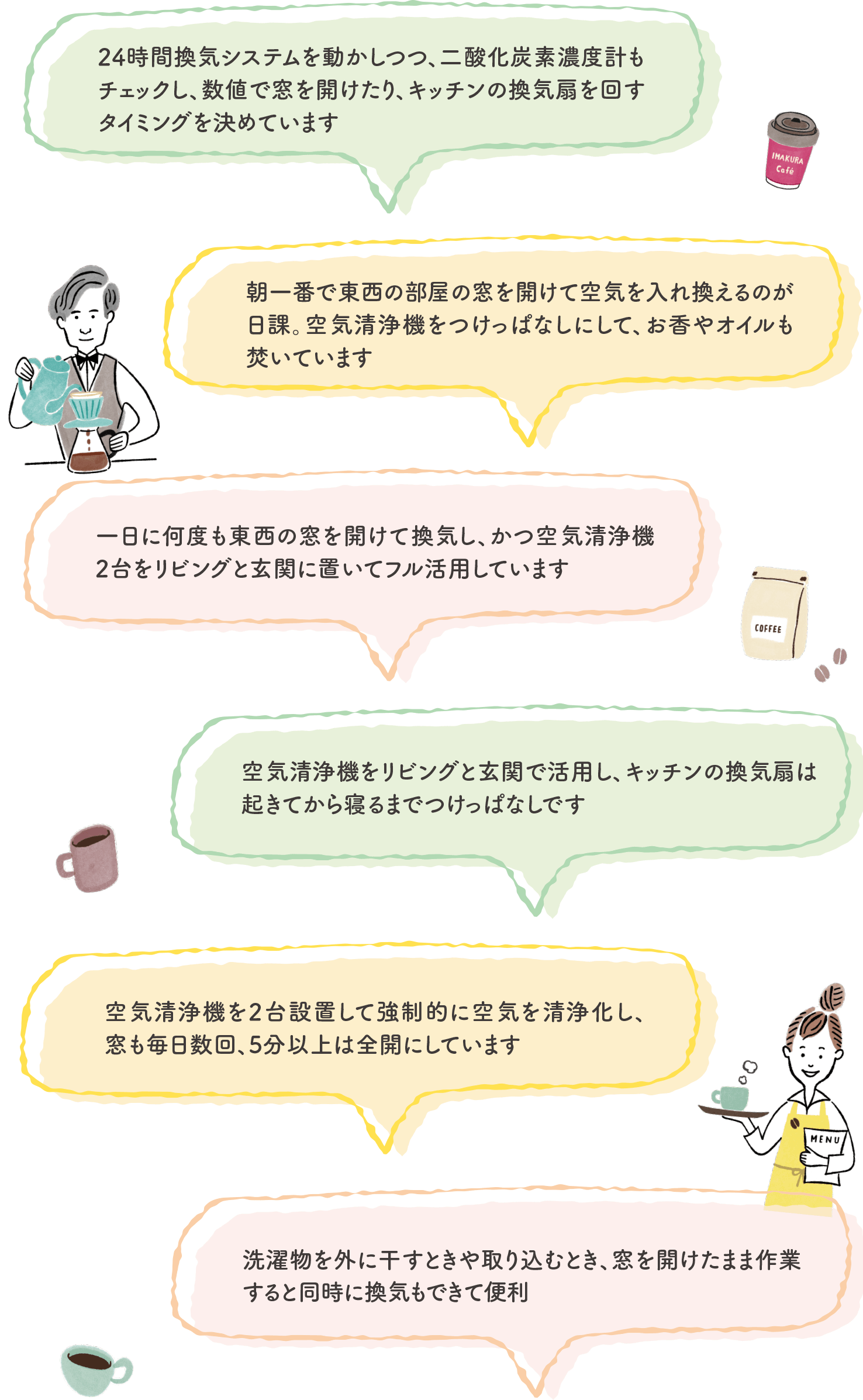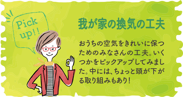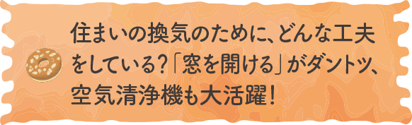 では、みなさんはふだん、換気のためにどんな工夫をしているのでしょうか?当然ながら、「窓を開ける」が圧倒的。「1~2時間ごとに窓を開けて換気する」、「起きたらすべての窓を開けて、家中の空気を入れ換える」など、努力がうかがえます。また、「2カ所の窓を開ける」と答えた人もけっこういました。実はこれ、上手な換気のコツなんです。1カ所の窓を全開にしても部屋の空気はたいして動かず、冬は気温が下がって寒いだけになってしまいます。なるべく対角線上になるように2カ所の窓を開けて、空気の通り道をつくりましょう。