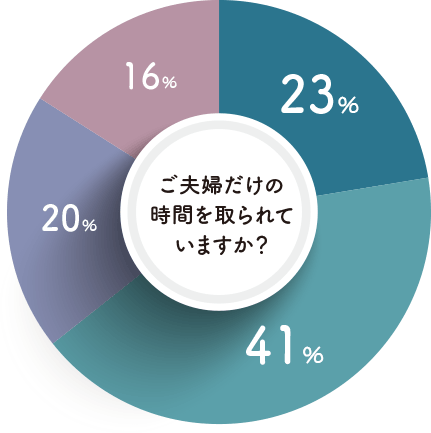 共働きで仕事、家事、そして育児と忙しく過ごしている家庭が多い現在、夫婦水入らずの時間をつくるのって、なかなか大変かも…。そんな先入観を抱きつつ、ブランシエラクラブ会員のみなさんの声を聞いてみると、うれしい驚き!ふだんの暮らしの中でちゃんと夫婦だけの時間を取っている人が、なんと6割以上もいらっしゃいました。けっこうみなさん、仲良しなんですね♪一方で、「心がけてはいるが、なかなか時間が取れない」とお悩みの人が2割、「全く取れていない」という悲しい答えも少なからずあって、コミュニケーション不足の夫婦も多いことがわかりました。