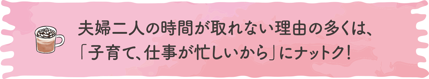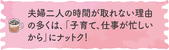 夫婦の時間が「取れない」、「取りにくい」と感じている人に、その理由を聞いたところ、ダントツで多かったのが「子育てで忙しい」でした。やはり、小さなお子さんがいる家庭だと、夫婦二人きりでゆっくりと過ごすのは難しそうですね。「夜は子どもを寝かすとそのまま一緒に寝てしまうし、休日も子どもを中心に過ごすから夫婦だけの時間なんて取れない」、「たまの週末にデートしたいけれど、近くに預かってくれる親がいるわけでもなく、子どもを置いて二人で出かけるのは無理」といったコメントに、思わず首を縦に振ってうなずくママも多いのでは?