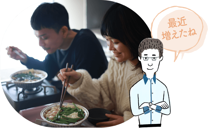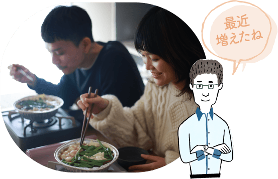 家族や夫婦がそろって食卓につき、美味しい料理に舌鼓を打ちながら、今日一日の出来事を楽しく語り合う。これって夫婦円満の最大の秘訣かも♪ただ、帰宅時間がバラバラで、夕食を別々に取らざるを得ない家庭もチラホラ見えます。ずっとこの状態が続くと会話の機会も減ってしまいますから、せめて休日ぐらいは夫婦一緒に食事を楽しみたいものですね。