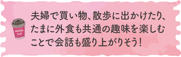 では、ふだんはご夫婦一緒にどんなことを楽しんでいるのでしょうか?多かったのは「食事」、「買い物」、「散歩」という返答でした。週末、誘いあってお気に入りのお店で外食をしたり、スーパーに一緒に買い物に出かけたり、運動がてら仲良く散歩をしているカップルの姿も目に浮かんできます。また、お酒でコミュニケーションを図っているご夫婦もいて、「子どもが寝た後、二人で晩酌をするのが楽しみ♪」、「週末は外でお酒を飲んでおしゃべりに花を咲かせる」といったコメントもありました。共通の趣味を楽しむご夫婦も目立ちます。