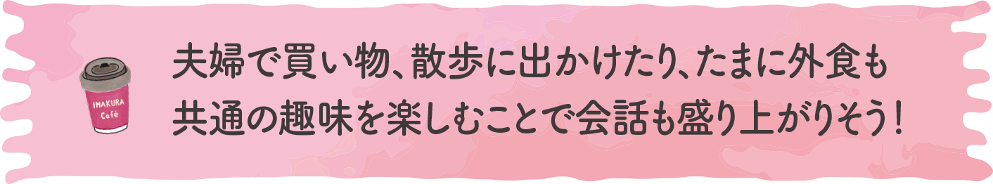 「ゴルフやスキーに行く」、「登山・トレッキングをする」、「映画や音楽を鑑賞する」、「ゲームに熱中する」という人や、中には「一緒に家庭菜園に精を出す」という人も。趣味に没頭していると心が満たされますが、気心の知れた夫婦なら充実感も倍増しそうですね。楽しい時間を共有することで夫婦の絆も強まりますし、共通の話題で会話も盛り上がるはず。あらためて相手のよいところに気づくこともあるでしょう。パートナーを誘って何か新しい趣味を始めてみるのもいいかもしれません。
