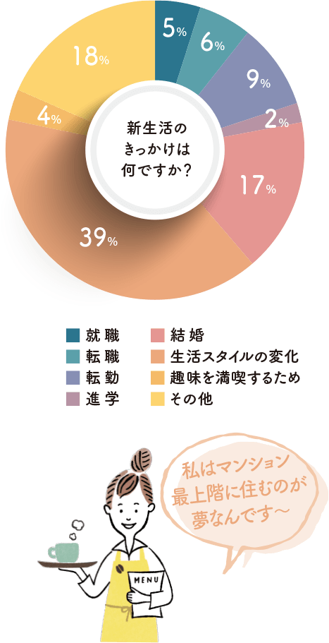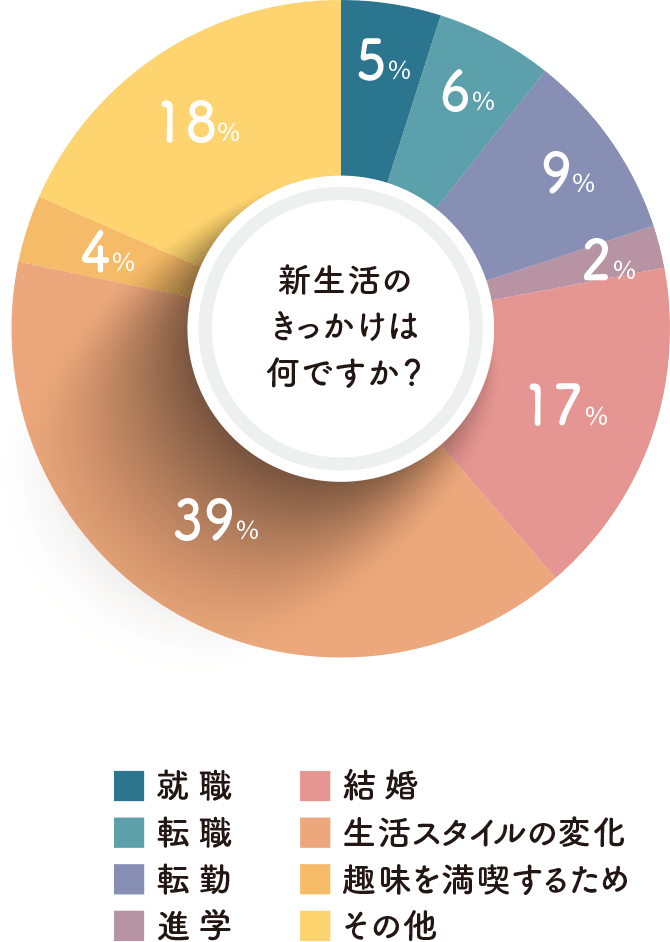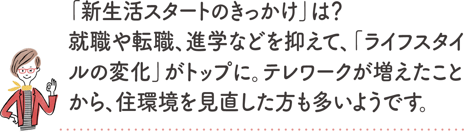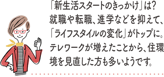 どのような理由で新しい生活をスタートさせたのか?「転職」「就職」「進学」などの定番理由を抑えてトップをとったのは「ライフスタイルの変化」でした。