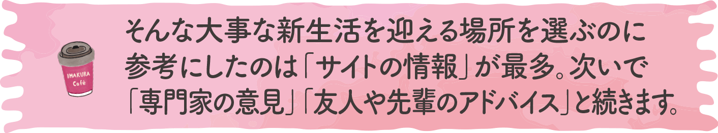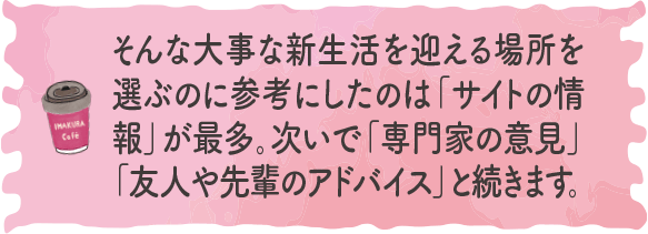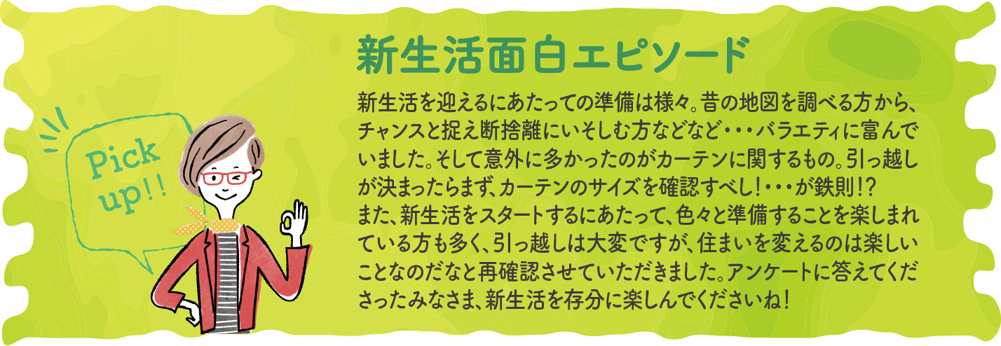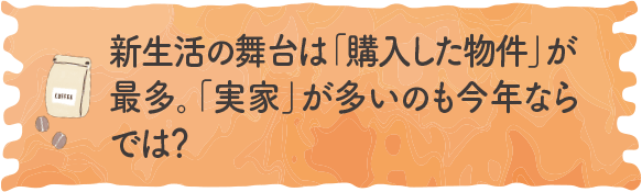 では、新生活を送る舞台はどんなところなのでしょう?一番多かったのは「購入した物件」ですが、3位は「実家」。「コロナ渦でリモート勤務になったため、都内から実家がある横浜に戻りました」や「実家の建て替えに伴い同居」など実家に戻られる方も多かったようです。「実家の、当時自分の使っていた部屋の掃除をしていたら、学生時代の笑えるものが色々出て来た」ということもあるそうなので、楽しみもあるようですよ。