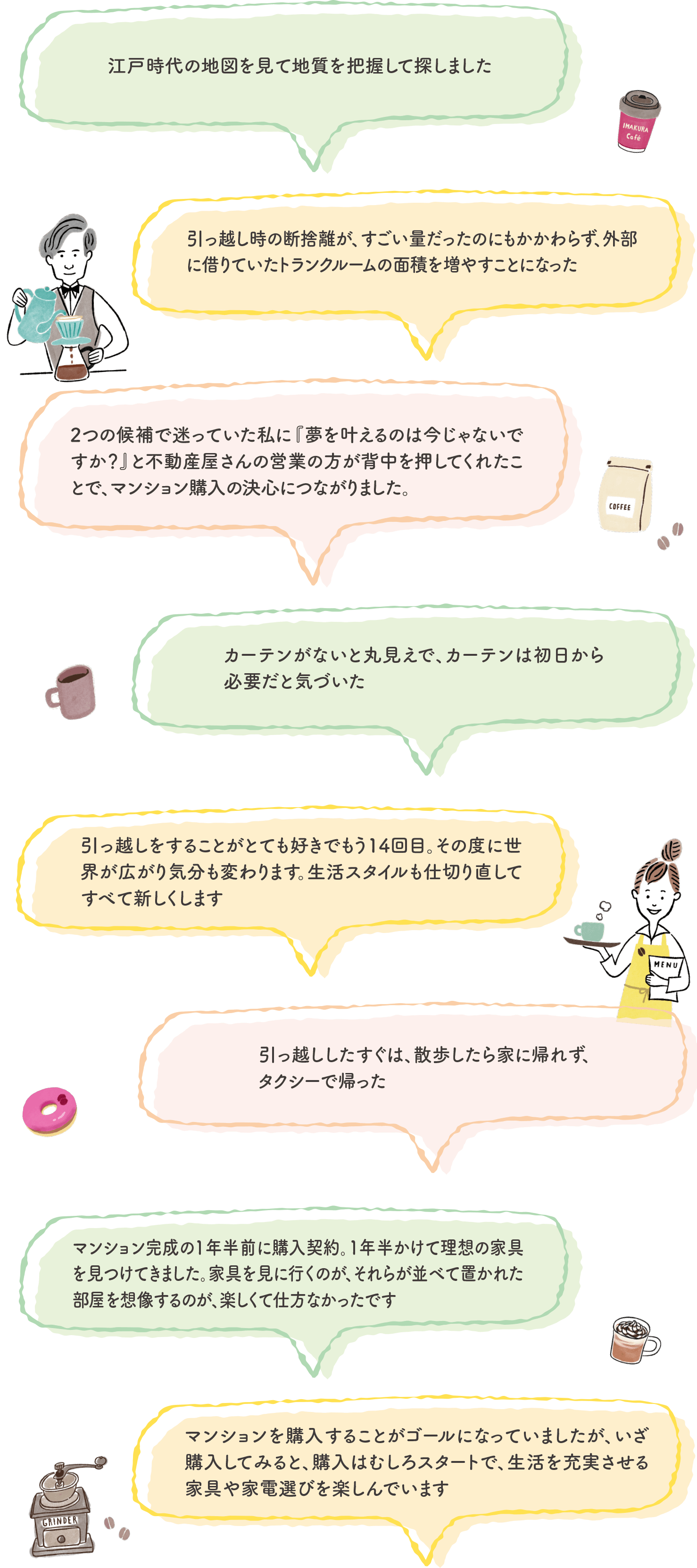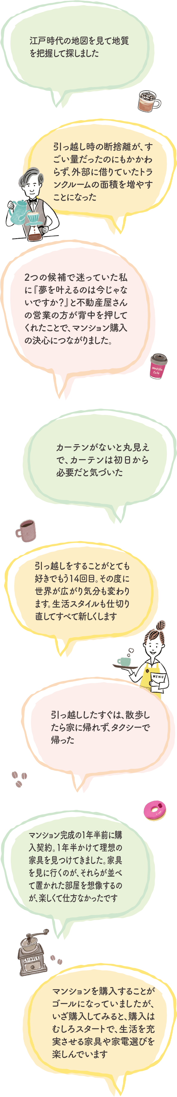 「テレワークに適した場所」「テレワークに快適なこと」とずばり挙げている方もいて、やはり、テレワークが増えたことも一因のようです。中には「海が好きなので、リモートワークへの切り替えを機に海が見えるマンションを購入しました。毎日海を見ながら仕事ができて幸せです」なんてうらやましい方も!場所に縛られない仕事のしかたへの変化、ずっと憧れていた場所に住まいを移すのもよいかもしれませんね。