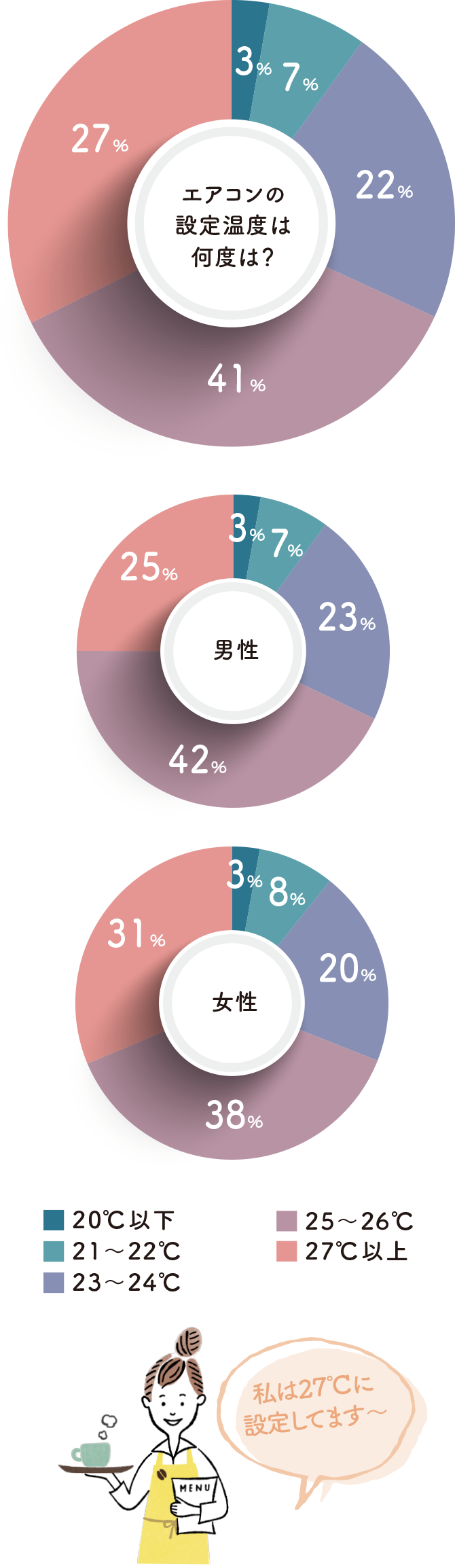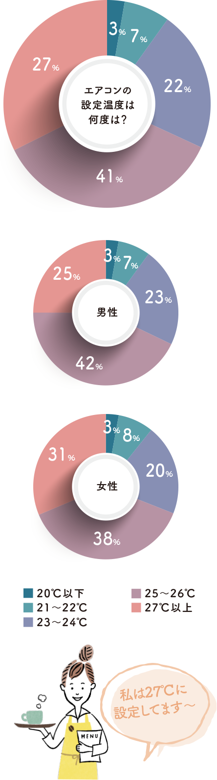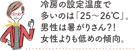 また、男女別に見てみると、男性の方が設定温度は低めの傾向。男性はやや暑がりであることがわかります。ちなみに冷房時に1℃高めに設定すると約10%も節電になるそうです。ムダに冷えすぎないようにこまめに温度調節をしたいものですね。運転を停止するよりも、温度設定で調整した方が、節電効果が高くておトクになりますよ。