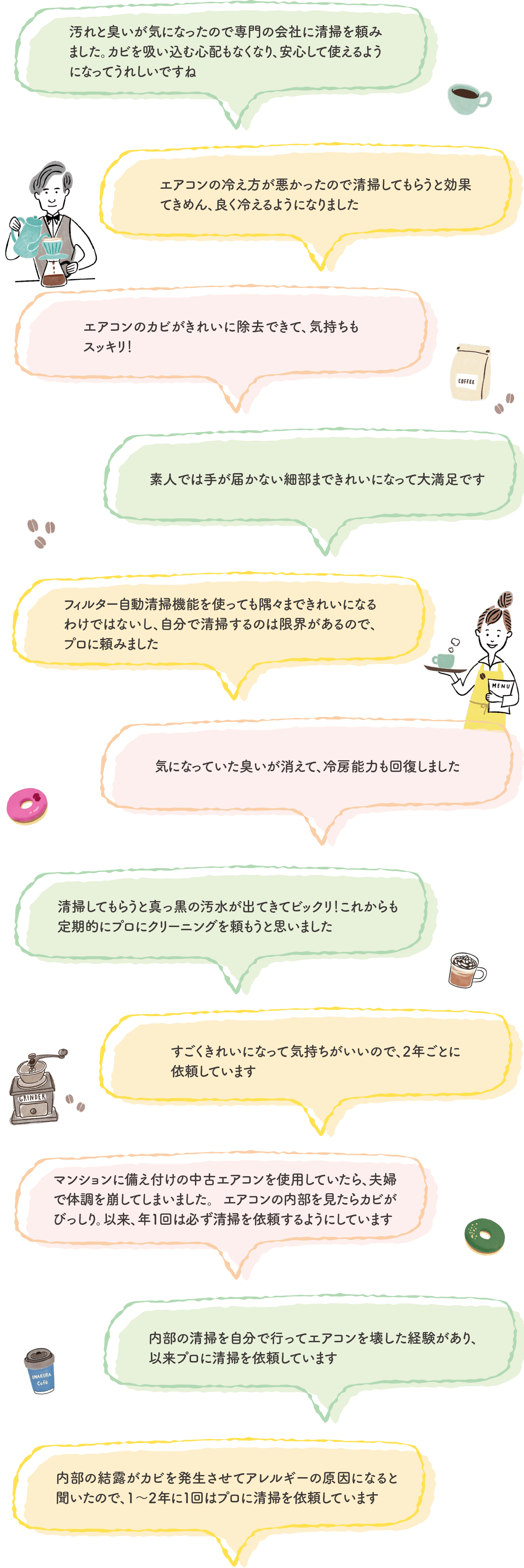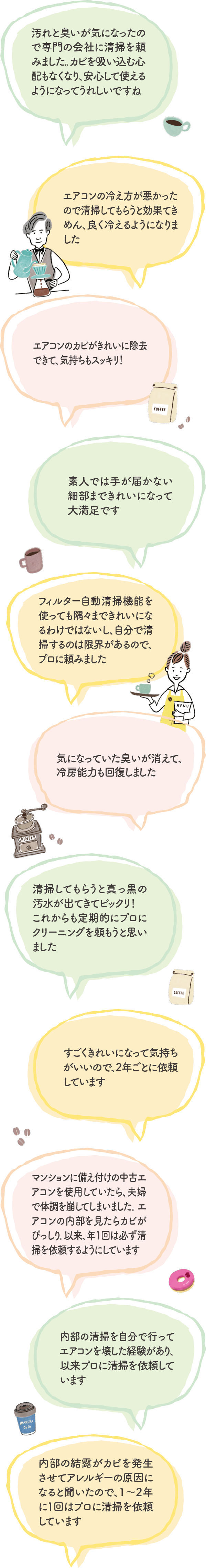 ただし、家庭で掃除できるのはフィルターや吹き出し口といった外側のみで、エアコンの内部にこびりついた汚れまではきれいに除去できません。プロに依頼して奥の汚れまできれいにクリーニングしてもらいたいと思う人も多いのでは?実際、会員のみなさんの3人に1人はエアコンの清掃を依頼した経験があるようです。エアコンのパーツを分解して内部まで掃除してもらえば、奥に潜むカビやハウスダストも一網打尽。イヤな臭いや健康被害も防げますし、エアコン本来の能力がよみがえって効きもよくなります。臭いや冷房の効きの悪さを感じたら、エアコンクリーニングを検討するタイミングかも。早めの対策で、この夏をスッキリと快適に過ごしましょう。