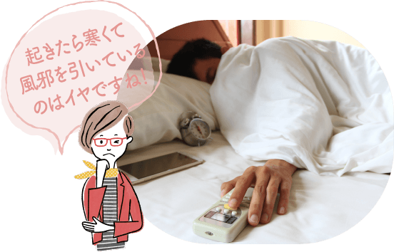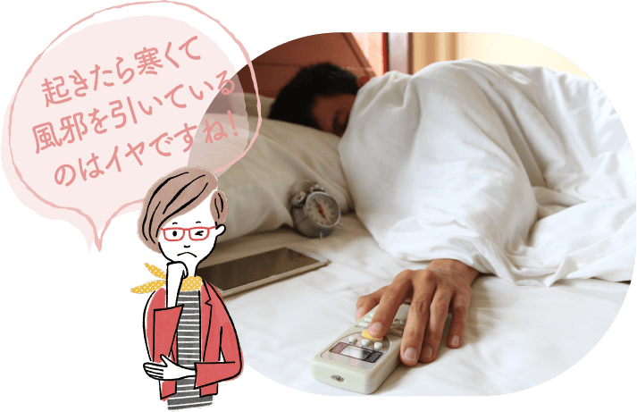 また、「ちょっと暑いなぁ」と感じたら、風量を強くするのも賢い手。体感温度が下がって涼しく感じますし、温度設定を下げるよりも消費電力が少なく済みます。寝室の場合は、就寝の1時間前に低めの温度でエアコンをつけて部屋を冷やしておきましょう。そして寝るときに快適な温度まで上げると、寝付きが良くなり、寝ている間も身体が冷えすぎなくて安心ですよ。