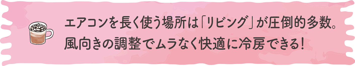 家の中でエアコンを使用する時間が一番長い場所はどこですか?会員のみなさんからの回答を見ると、「リビング」が圧倒的多数でしたが、「寝室」と答えた人も少なからずいました。リビングは家族が集まり、一緒に長く過ごす場所ですから、電気代を節約しつつ、居心地のよい涼しさをキープしたいもの。その秘訣は風向きにあり!冷房の効率を上げるために、風向きを水平または上向きにしておくのをおすすめします。冷たい空気は部屋の下のほうにたまりがちなので、風向きを水平や上向きに調節することで冷気が上から下へ降り、ムラなく冷房できます。扇風機やサーキュレーターを併用して、部屋の空気をかき混ぜるとさらに効果的です。