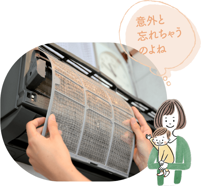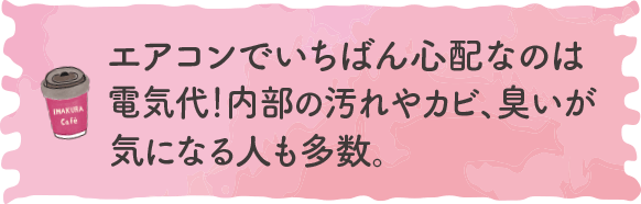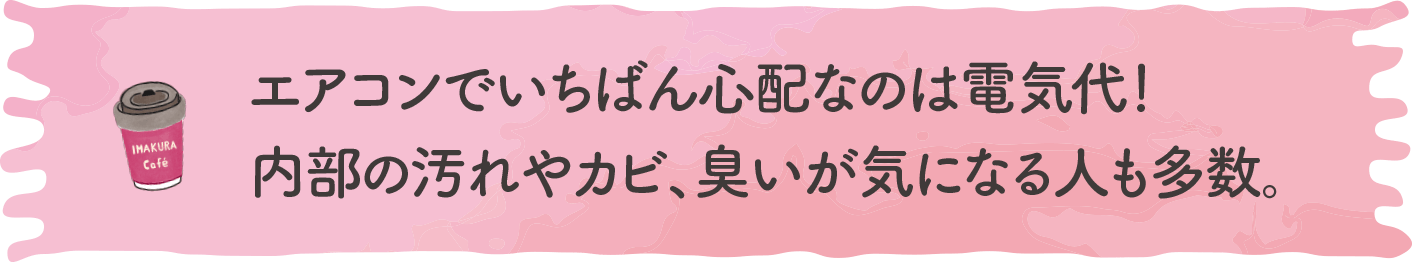 コロナ禍による外出自粛の影響もあって、今年の夏も自宅で冷房を使用する時間が増えそうです。そうなると、心配なのが電気代ですよね。会員のみなさんからも、「エアコンを使っていて一番気になるのは電気代!」という声がたくさん上がっています。同様に多いのが「内部の汚れやカビ」、「臭い」でした。これ、すべてお掃除と関係があるかも…。温度設定を高くしたり、エアコンの機能を賢く使ったりすると電気代が節約できることは前の項目でお伝えしましたが、実はこまめなお掃除も節電に効果的。エアコンのフィルターにホコリが詰まってしまうと運転効率が悪くなり、余計な電気代がかかってしまうからです。