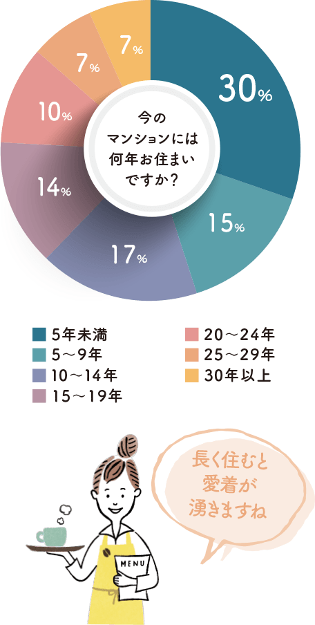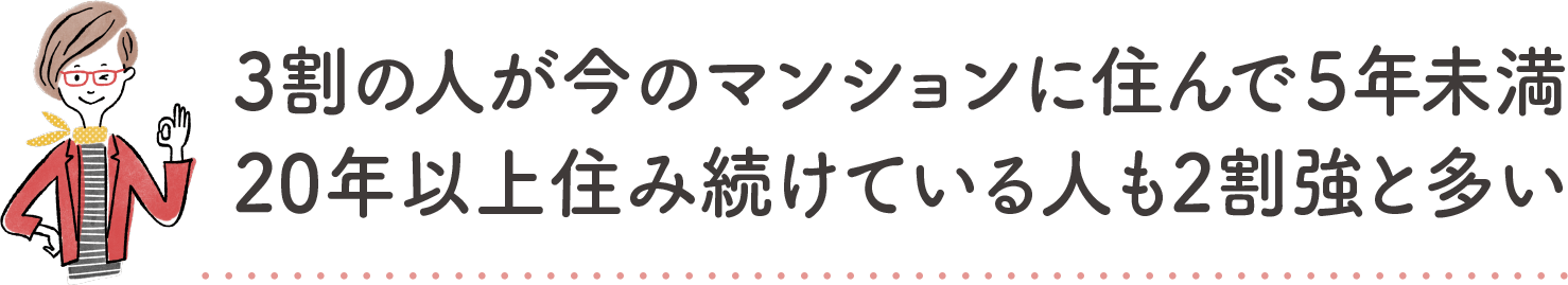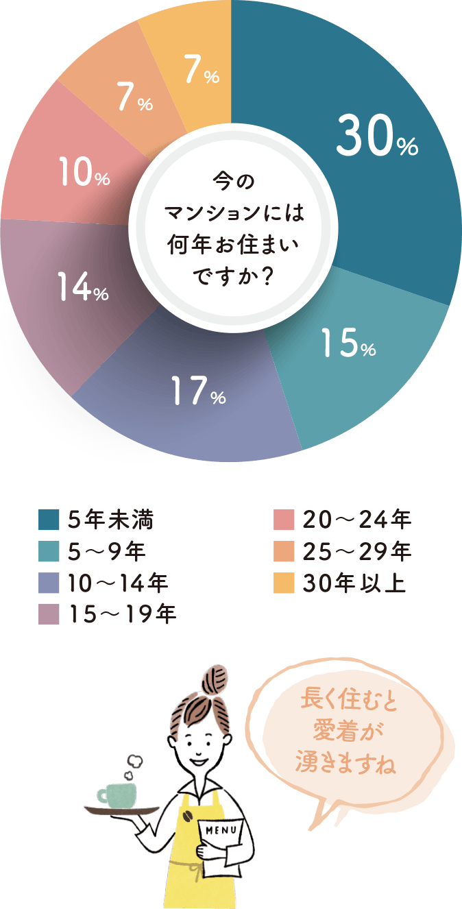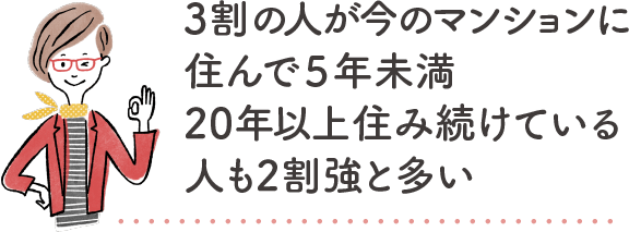 「今のマンションに住んで何年ぐらいですか?」と会員のみなさんに聞いたところ、最も多かったのが5年未満で30%でした。次いで10〜14年が17%、5〜9年が15%、15〜19年が14%と続きます。賃貸生活に区切りをつけてマンションを購入した人や、出産、子供の成長、シニアライフへの転換などを理由に住み替えをした人が多い印象です。一方で20年以上住んでいる人も合計すると24%に上り、そのなかで30年以上と答えた人が7%もいました。賃貸住宅と比べるとみなさん長く住み続けていらっしゃるようですね。