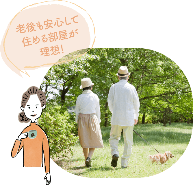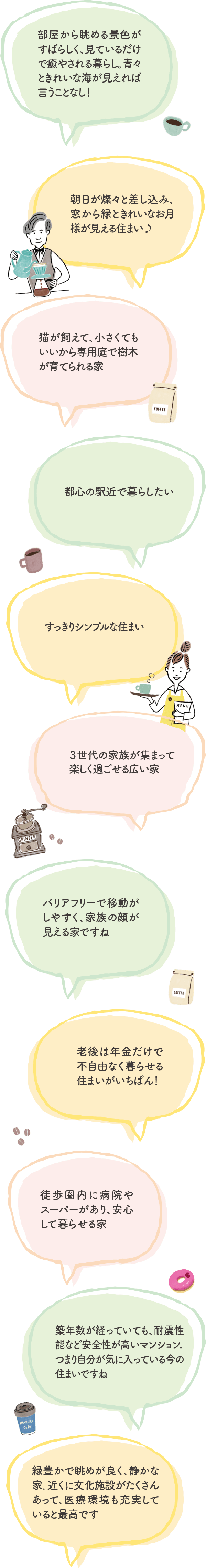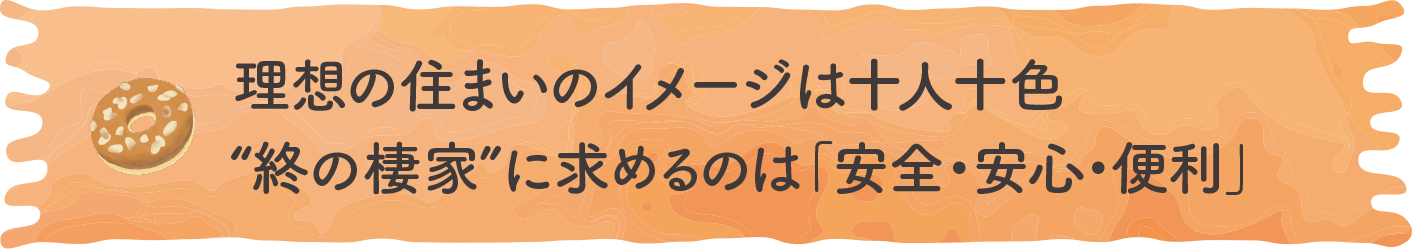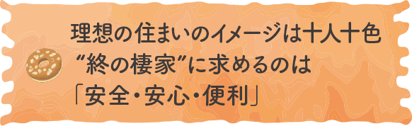 会員のみなさんの“理想”も千差万別。「日当たりと眺望の良いマンション」、「プライバシーを保ちつつ、家族が仲良く暮らせる住まい」、「駅またはバス停まで近く、スーパーマーケット、病院、銀行が徒歩圏内にある住まい」、「安心して住み続けられる災害に強い家」、「ペットの犬が快適に暮らせる家」など、多彩な答えが寄せられています。しかし、高齢になって“終の棲家”を考えるようになると頭に浮かぶのは、「安全・安心・便利」のよう。「バリアフリー」や「商業施設や医療施設が近くにある」ことを求める人が目立ちました。