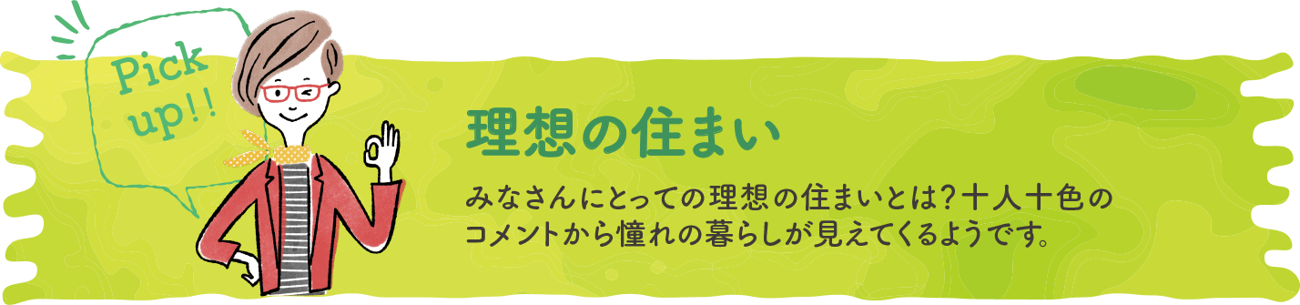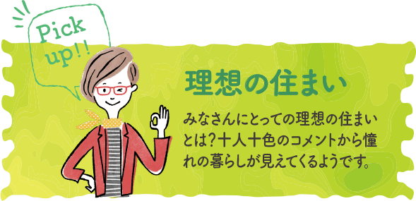 理想の住まいというと、よりゴージャスな暮らしのイメージを頭に描く人が多いのかと思いきや、みなさんけっこう現実的ですね。夢をただ大きく膨らませるのではなく、いつか実現できればうれしいという想いにあふれていました。