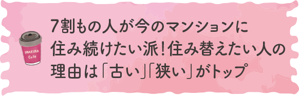 「今のマンションにずっと住み続けたいですか?」と尋ねたところ、会員のみなさんはなんと70%近くがYESの返答でした。お気に入りのマンションは、住むほどに愛着が湧いてくるもの。街に顔なじみのお店も増えれば、ずっとそこで暮らし続けたいですよね。引っ越しせずにリフォームをして住み続ける人も多く見受けられます。