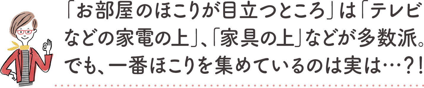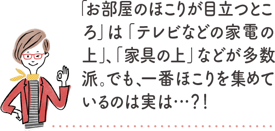 お部屋のほこり…どこが目立つでしょうか。「テレビなどの家電」「家具の上」などが上位。そもそも家電は静電気を発しているのでほこりが吸着しやすいようです。