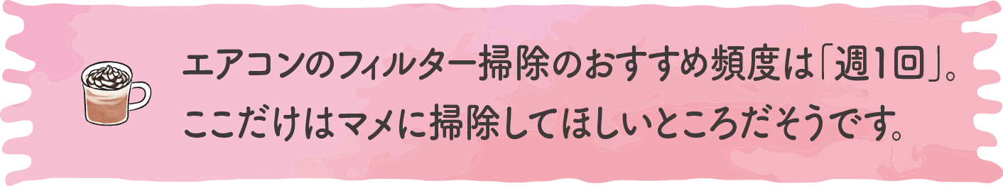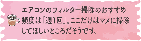 みなさんからの回答では、フィルター掃除の最適頻度は「月1回」が41%と最多でした。残念!専門家によると、掃除のおすすめ頻度は最も汚れるフィルターが「週1回」、ルーバーやカバーは3カ月に1回だそうです。フィルターの汚れは効率にも影響するようですので、電気代節約のためにもまめな掃除を心掛けたいものです。