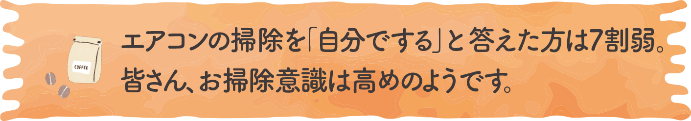 「エアコンを自分で掃除する」と答えた方は64%でした。掃除箇所は限定しなかったので、フィルターと室内機のカバーだけを掃除されている方、ご自身で内部まで掃除されている方、さまざまではないかと思いますが、みなさんエアコンの清潔さには関心をお持ちのようです。