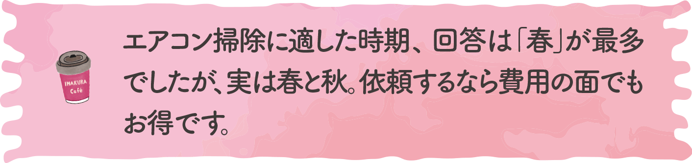 「エアコン掃除をするのに適した時期はいつだと思いますか?」という質問に対して、「春」という回答が40%弱を獲得して第1位。正解です。ただ秋も適しているのです。