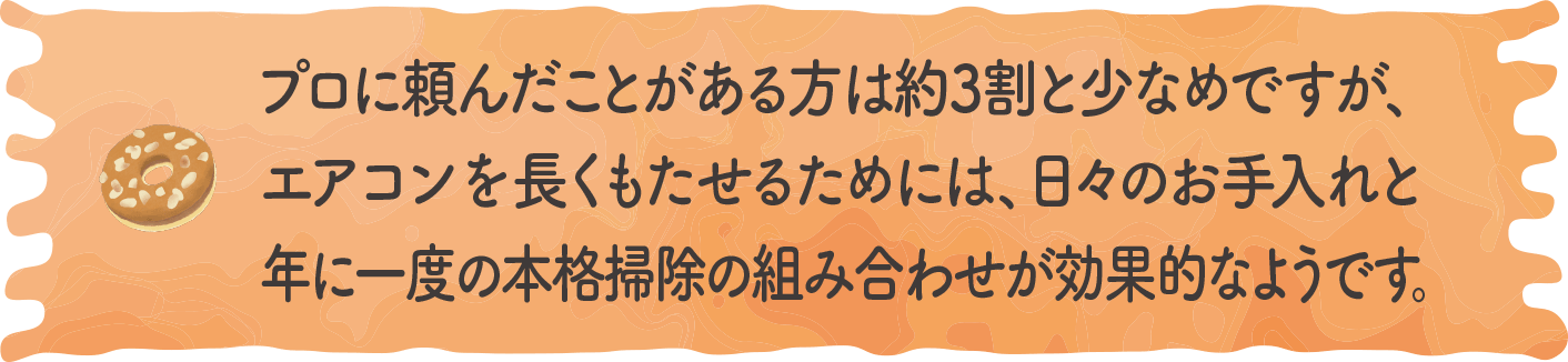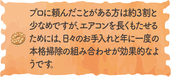 他の設問からの回答ですが「引っ越しのタイミングでクリーニングした」という方も目立ちました。退居の際に汚れたエアコンを外して分解清掃をし、新居につけてくれるサービスがあるようです。しかも通常よりもリーズナブルな価格になることもあるので、転居の際には確認してみてもよいかもしれません。
